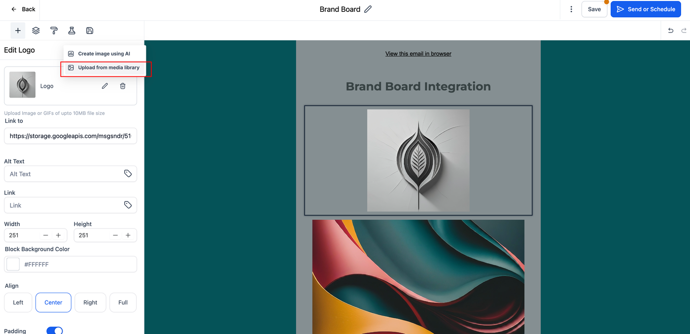 In der Media Library kannst du Logos aus allen deinen Brand Boards anzeigen und verwenden. So kannst du deine Branding-Elemente einfach in deine E-Mails integrieren.