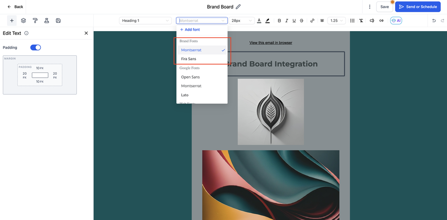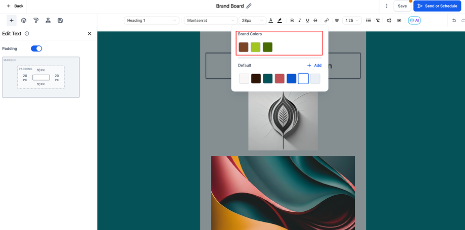 Nur die Schriftarten und Farben des Standard-Brand Boards werden im Farb- und Schriftarten-Picker im E-Mail-Editor angezeigt.