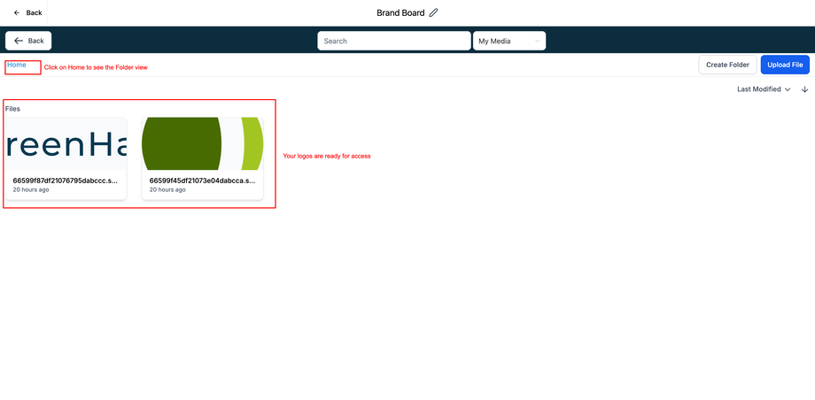 Du siehst dort alle Logos, die in deinen Brand Boards gespeichert sind.
