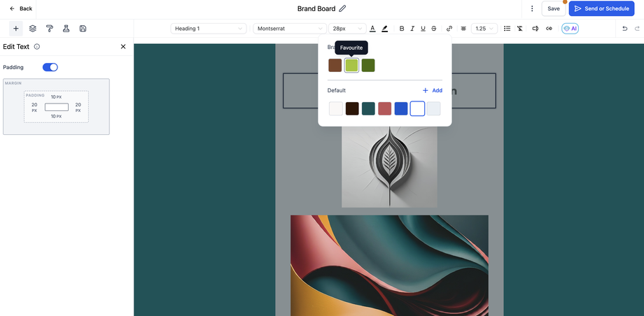Brand Boards vereinfachen den Prozess, indem sie voreingestellte Farben und Schriftarten direkt im E-Mail-Editor bereitstellen. Du musst dich nicht mit Custom Values oder komplizierten Code-Blöcken beschäftigen – einfach auswählen und anwenden.