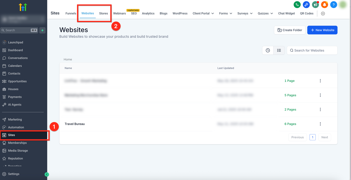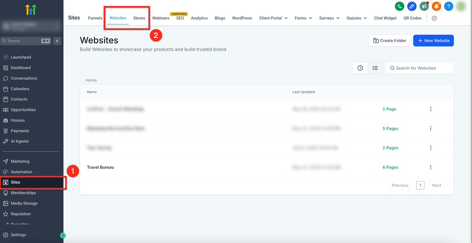 Klicke in der oberen Navigationsleiste auf Funnels oder Websites