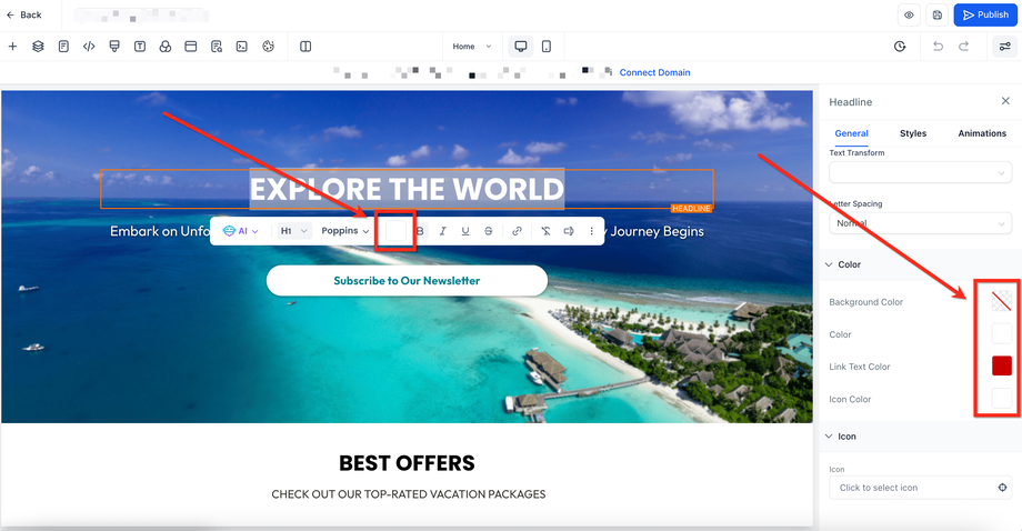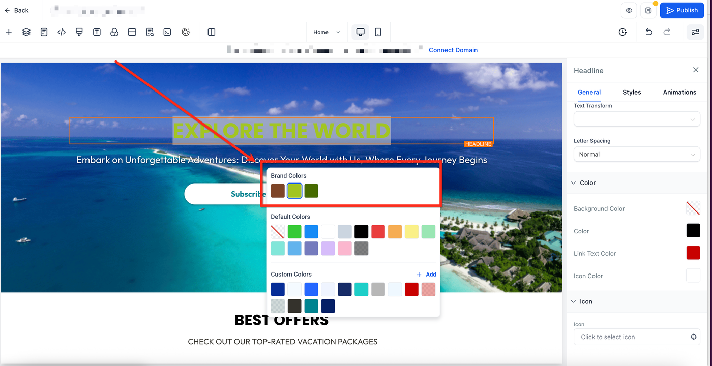 Sobald ein Brand Board erstellt wurde, erscheinen dessen Assets im Funnel- und Website-Builder. Dadurch kannst du mit einem Klick die richtigen Stile anwenden und sicherstellen, dass dein Branding auf allen Websites und Funnels einheitlich bleibt.
