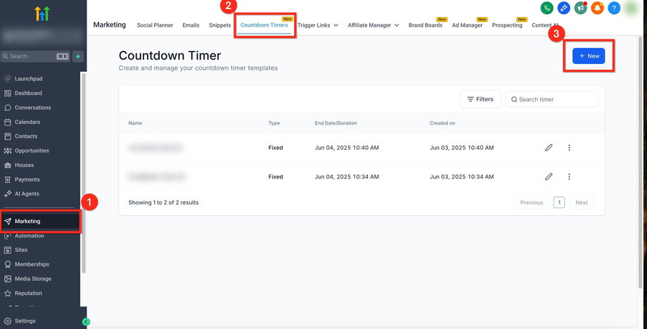 Marketing → Countdown TimersKlicke auf den blauen Button + New