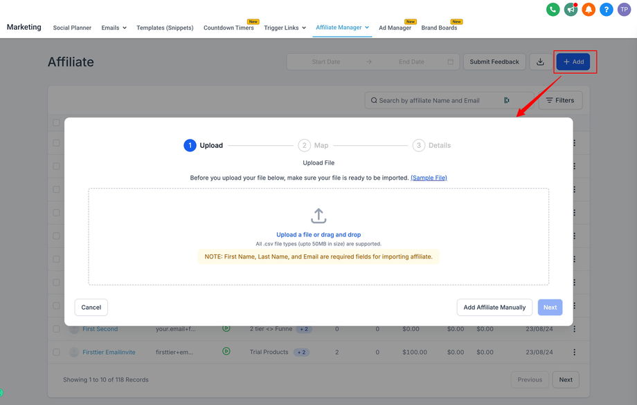 Gehe in den Bereich „Affiliate“ und klicke auf „Add“ → wähle „Upload Affiliate“.