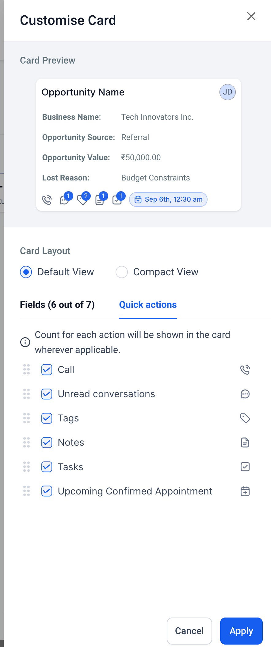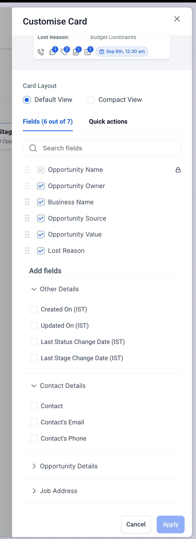 Sie können bis zu 7 Felder auf den Opportunity-Karten anzeigen lassen. Dazu gehören: