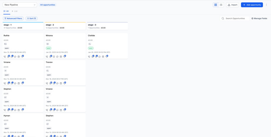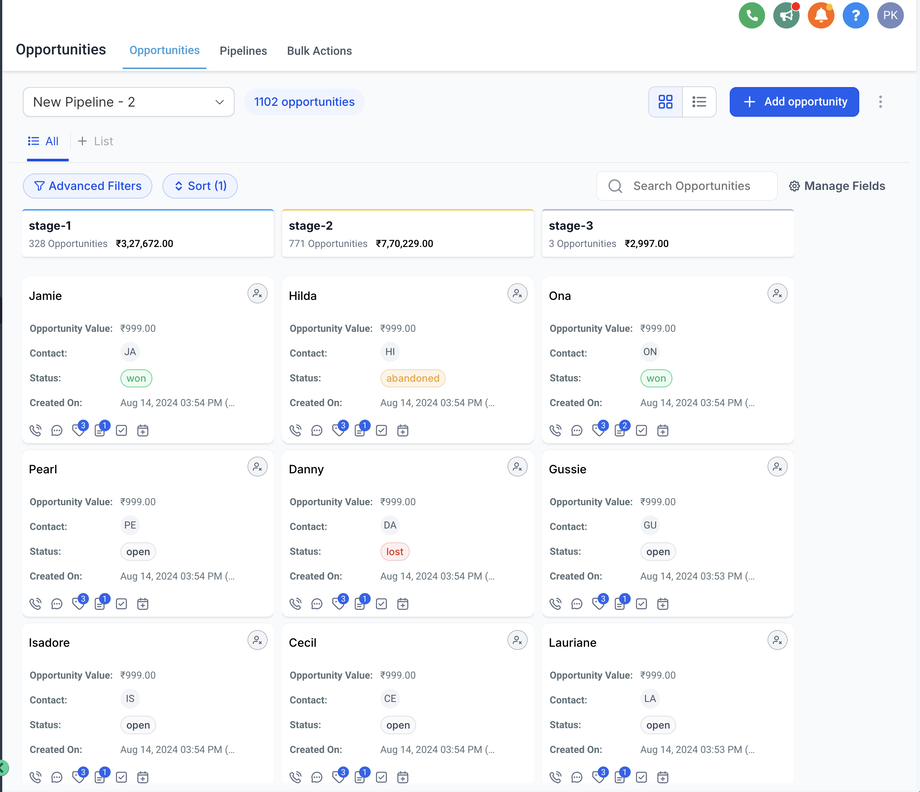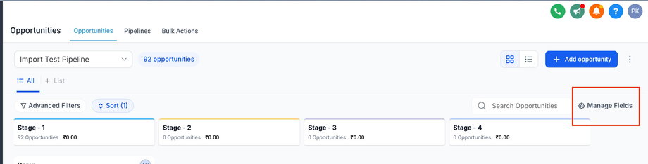 Klicken Sie auf die Option Manage Fields (oben rechts im Opportunity-Board).