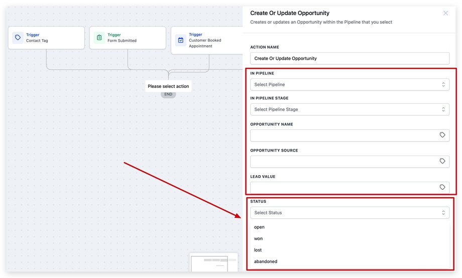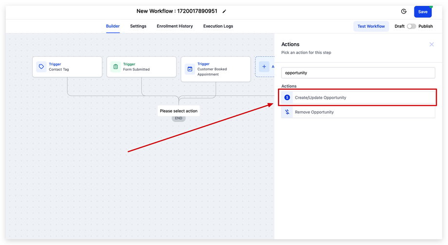 4. Füge die Workflow-Aktion „Create/Update Opportunity“ hinzu