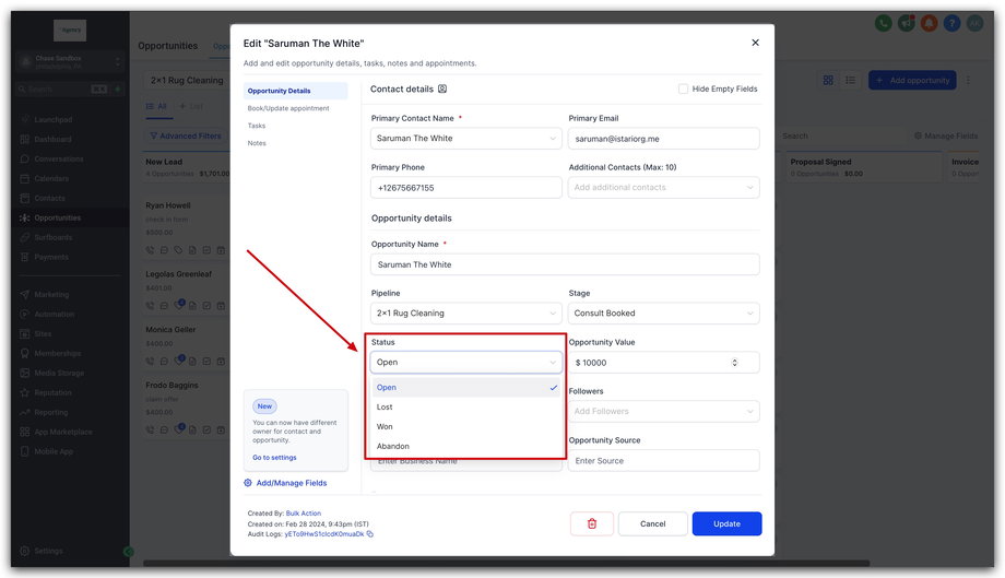 Klicke auf das Statusfeld, wähle den gewünschten Status (Open, Won, Lost, Abandoned) aus dem Dropdown-Menü und bestätige die Änderung.