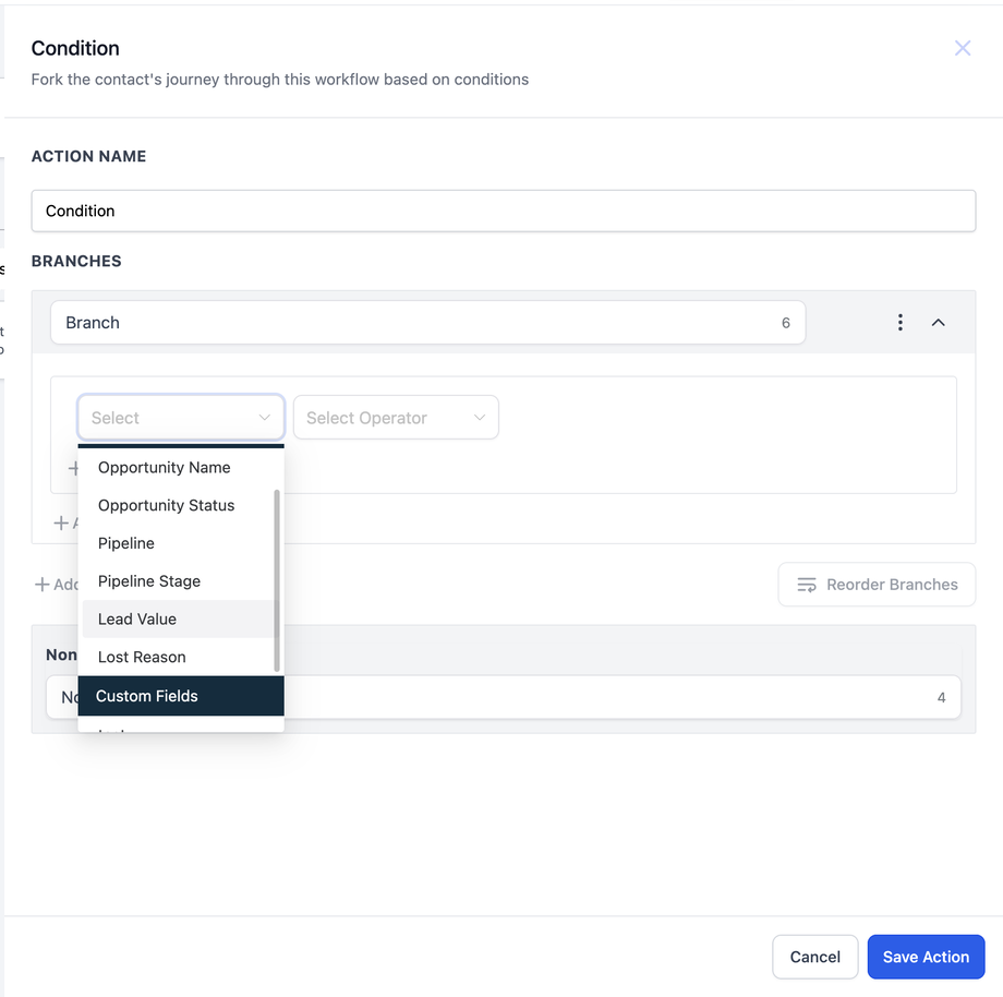 Opportunity-Felder können nur dann als Filter verwendet werden, wenn ein Opportunity-basierter Trigger im Workflow genutzt wird. Sowohl Standard- als auch Custom-Felder können für Verzweigungen verwendet werden.