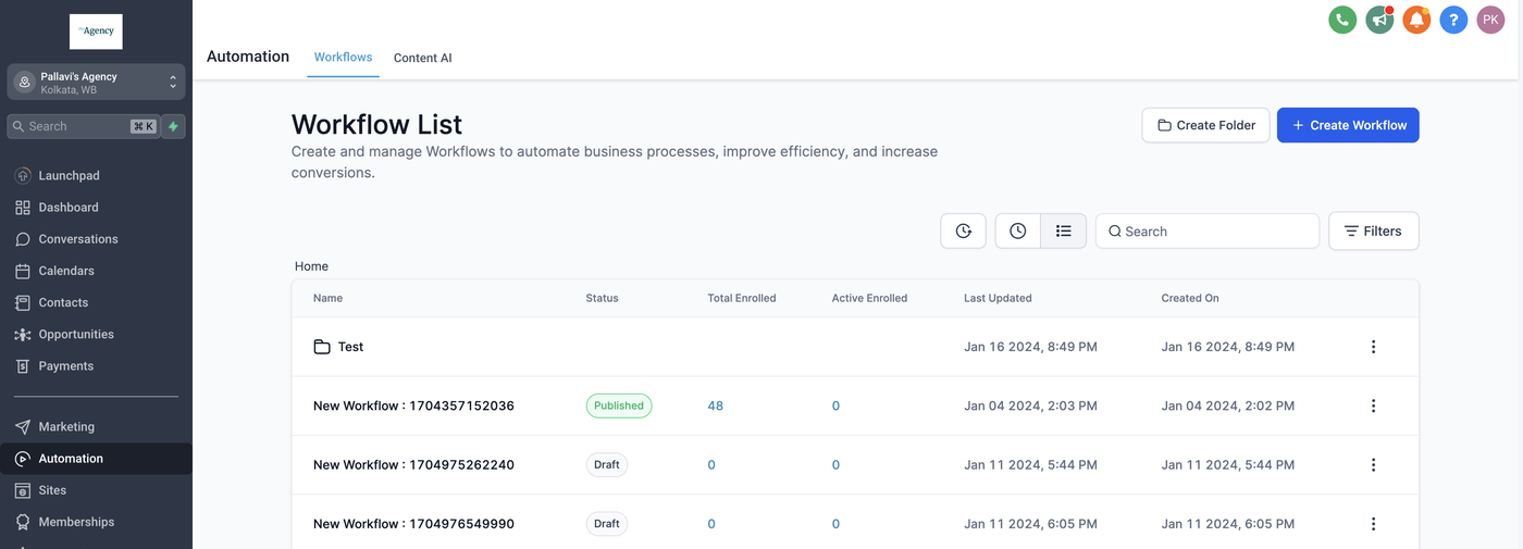 Navigiere in deinem GoHighLevel-Dashboard zum Bereich „Automations“.