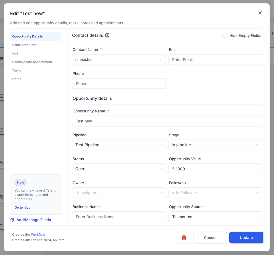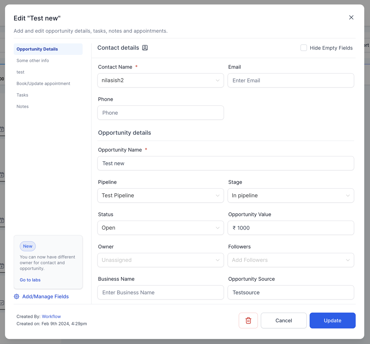 Aktualisiere relevante Details wie den Namen des Kontakts, Kontaktinformationen, Opportunity-Wert und Opportunity-Quelle.