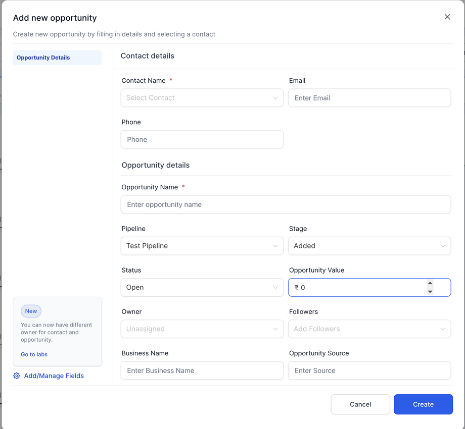 Hinweis: In HighLevel wird ein Kontakt zu einer Opportunity, wenn eine Verkaufs- oder Deal-Chance mit diesem Kontakt verbunden ist und dieser einer Sales-Pipeline hinzugefügt wird.