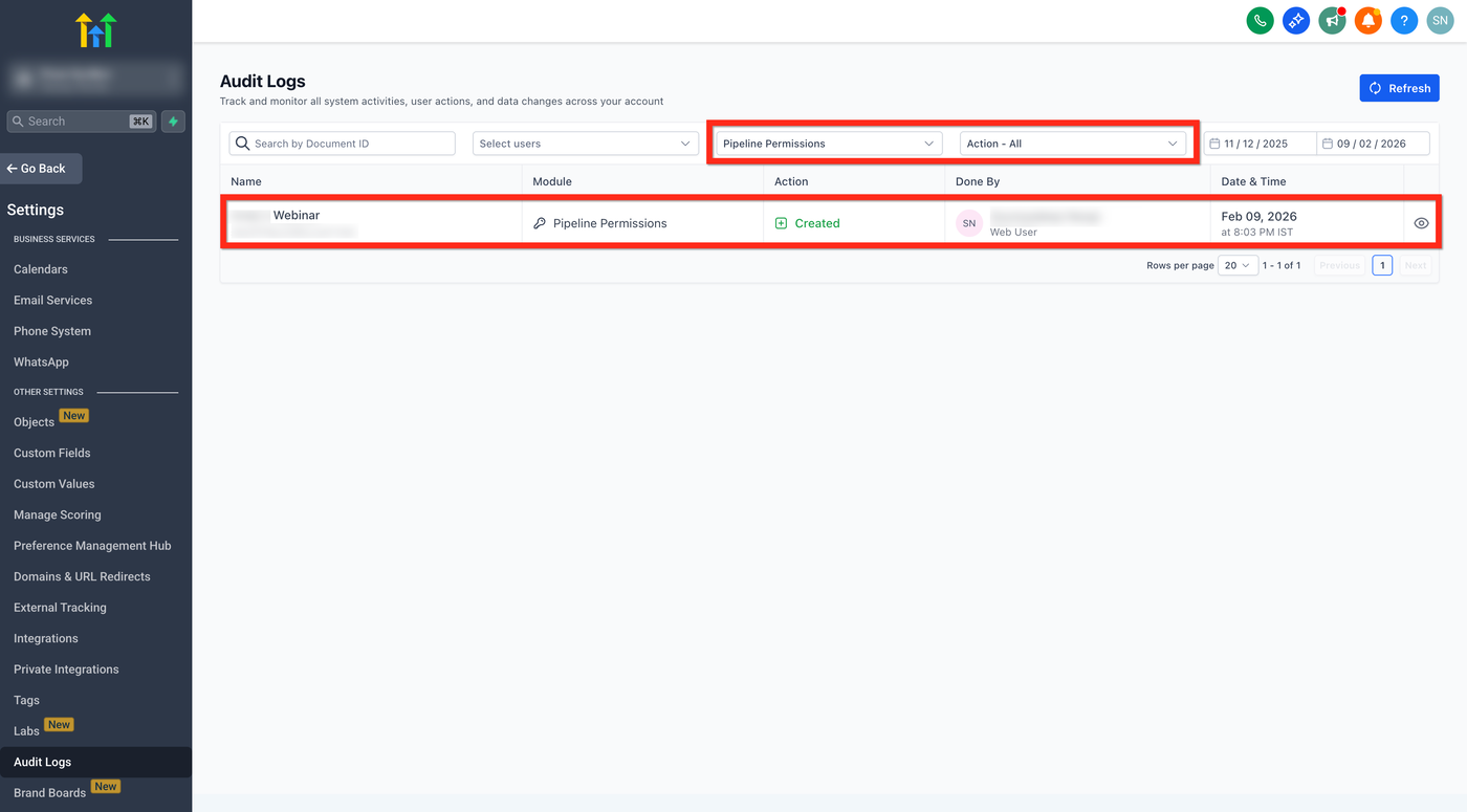 HighLevel protokolliert automatisch jede Erstellung, Änderung oder Entziehung von Berechtigungen – inklusive Nutzer, Pipeline, Aktion und Zeitstempel (für 60 Tage).