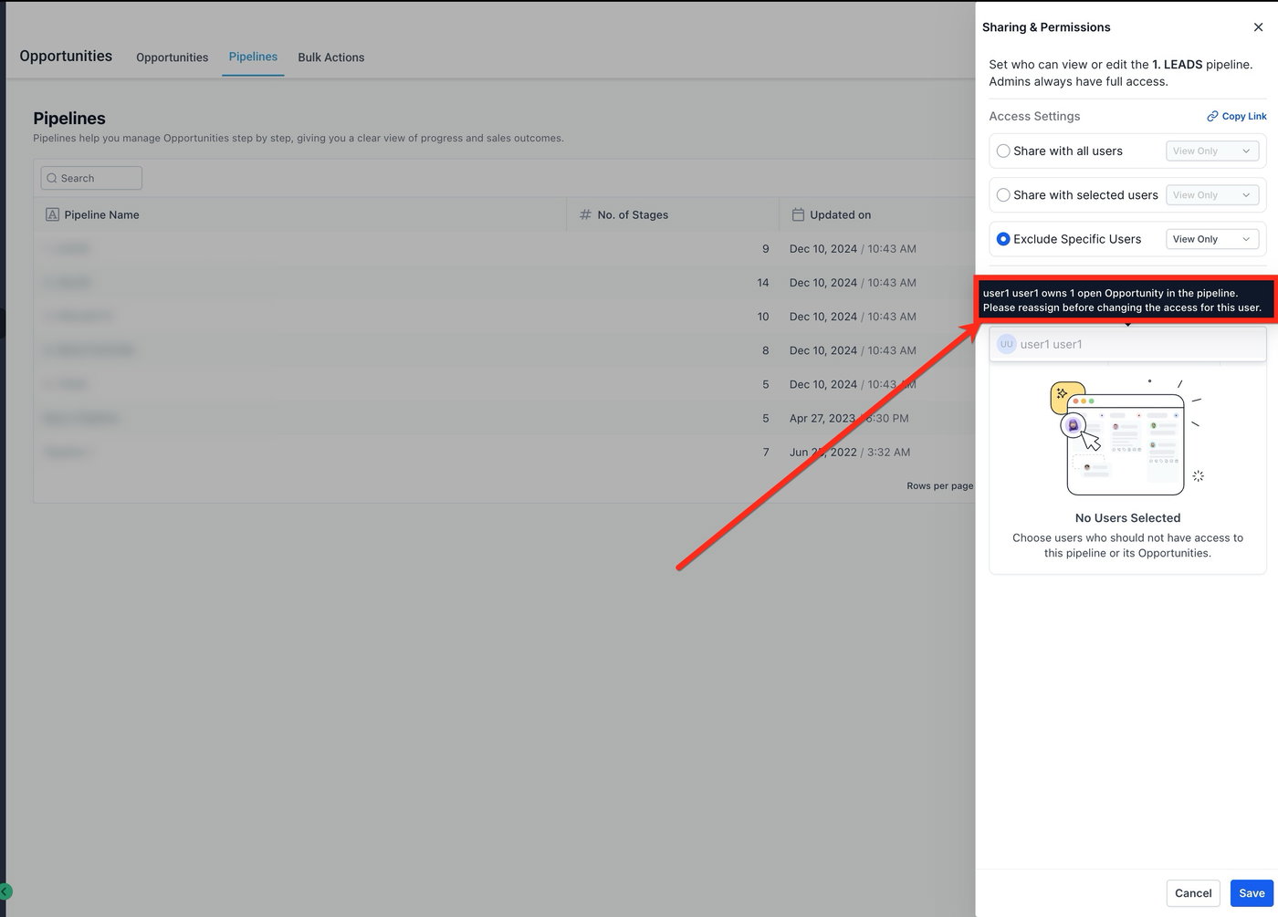 Das System verhindert, dass du einem Nutzer den Zugriff entziehst, wenn dieser noch Opportunities in dieser Pipeline besitzt.