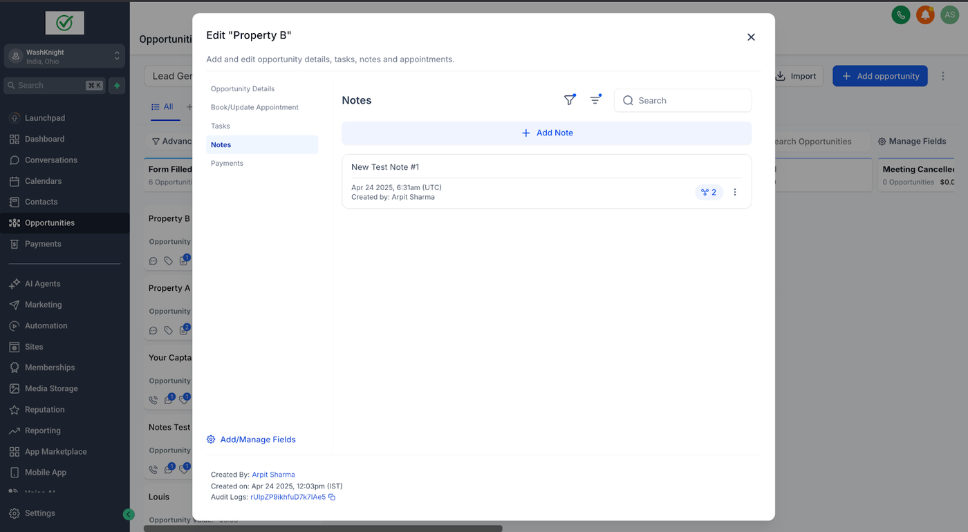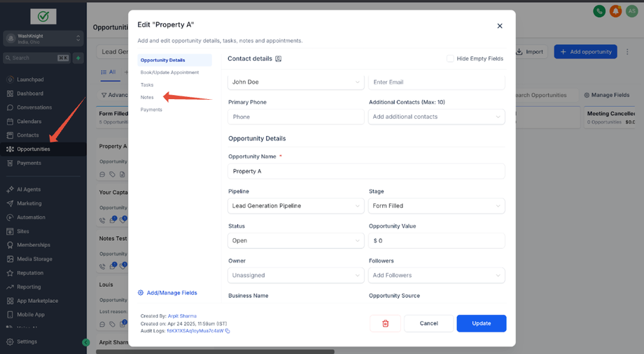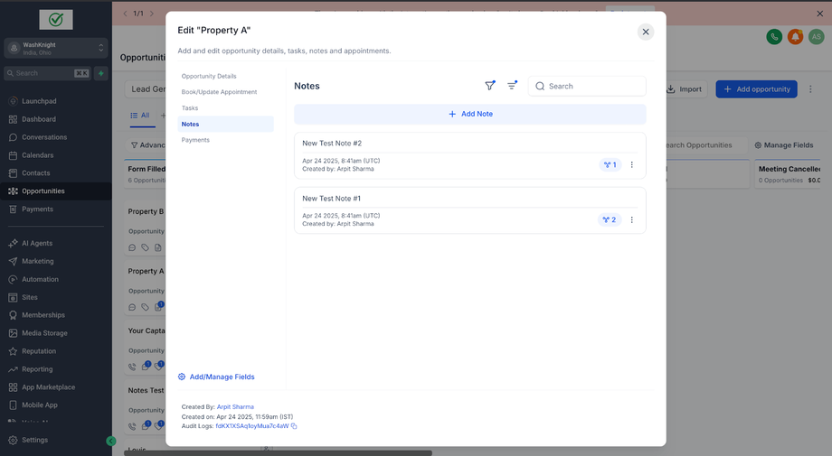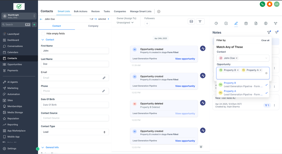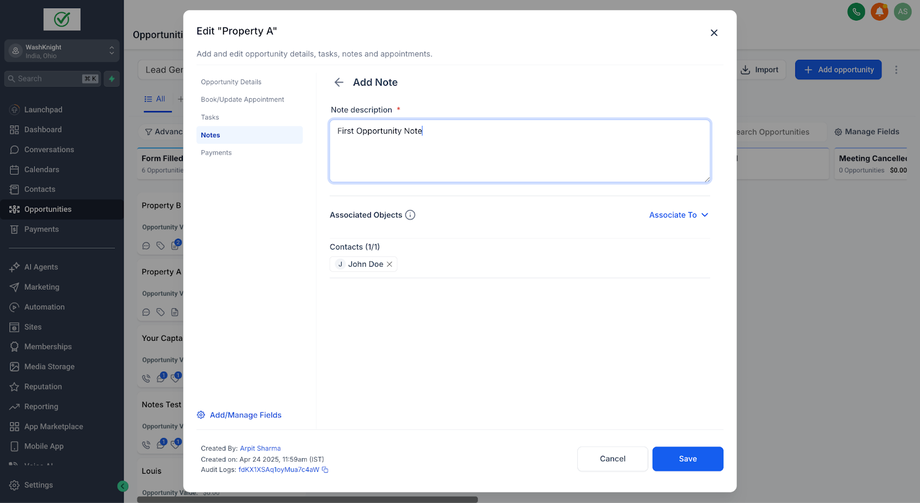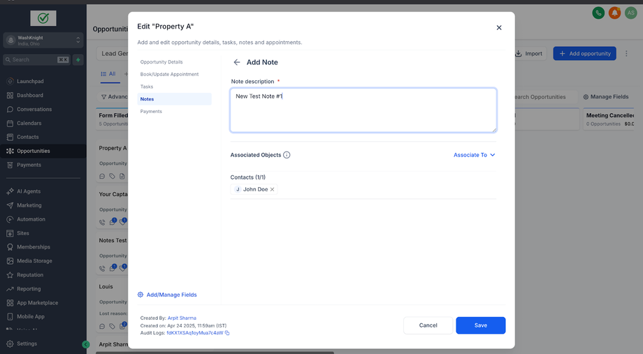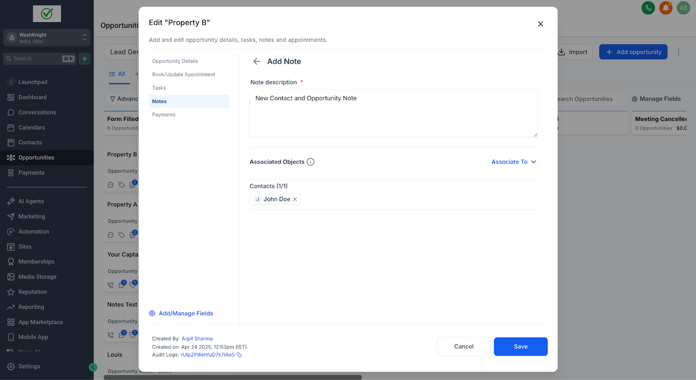 John Doe (ein Kontakt) hat zwei Opportunities für zwei verschiedene Immobilien: Property A und Property B. Sara (die Sales-Agentin & GHL-Admin), die die Immobilien für John Doe verwaltet, möchte spezifische Notizen für jede Opportunity erstellen, um relevante Informationen ausschließlich mit der jeweiligen Opportunity zu verknüpfen.