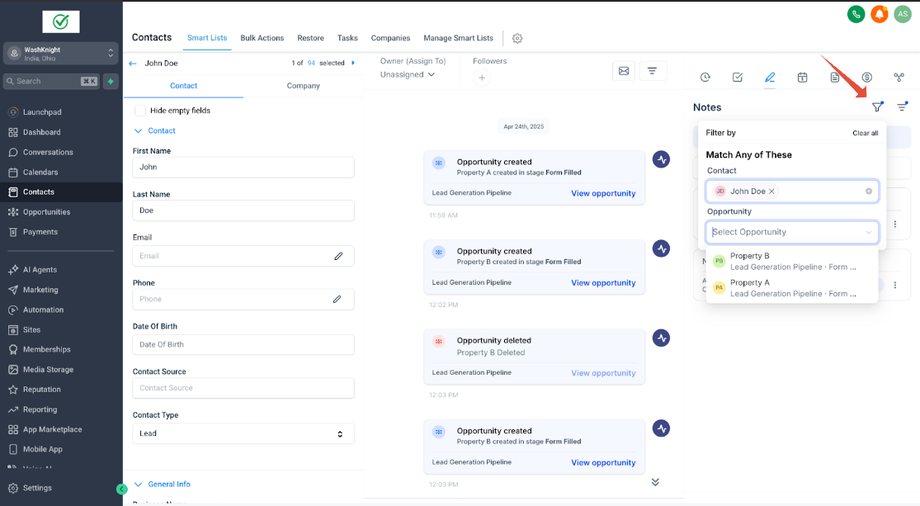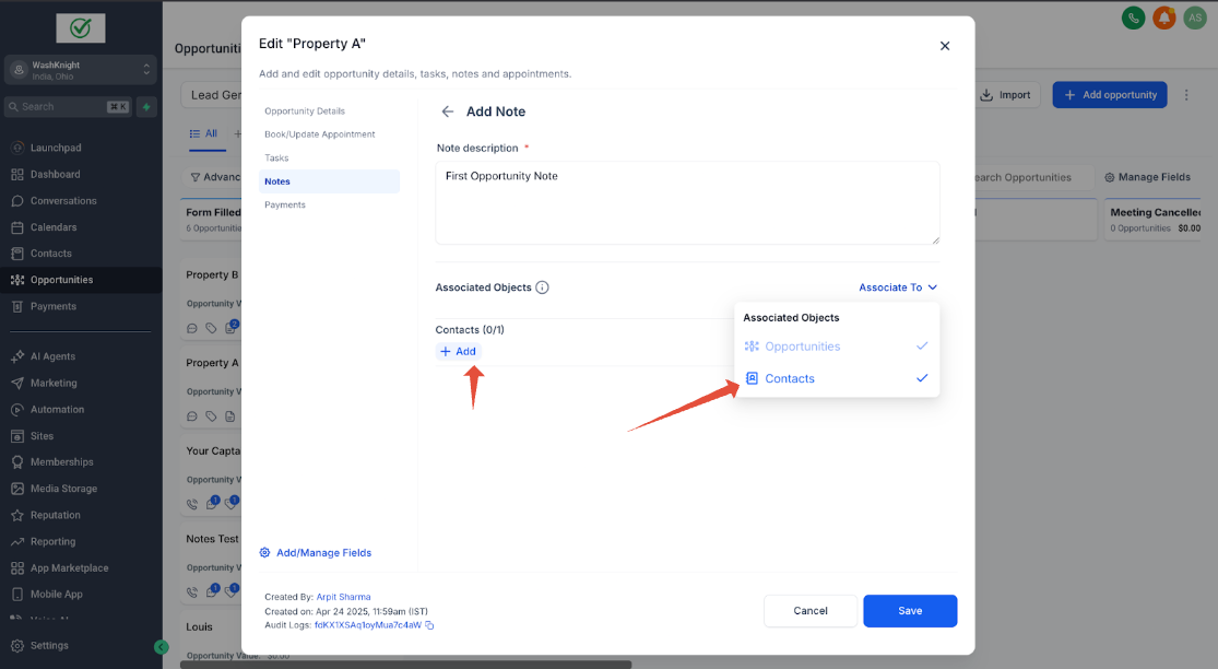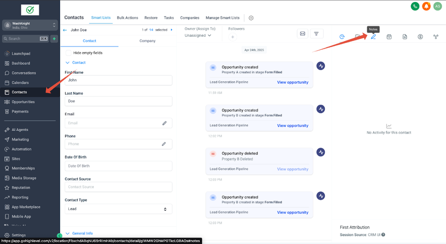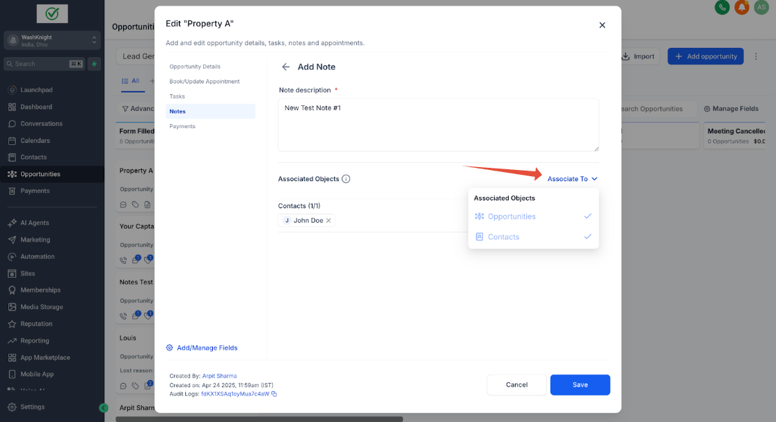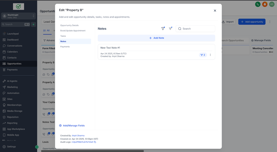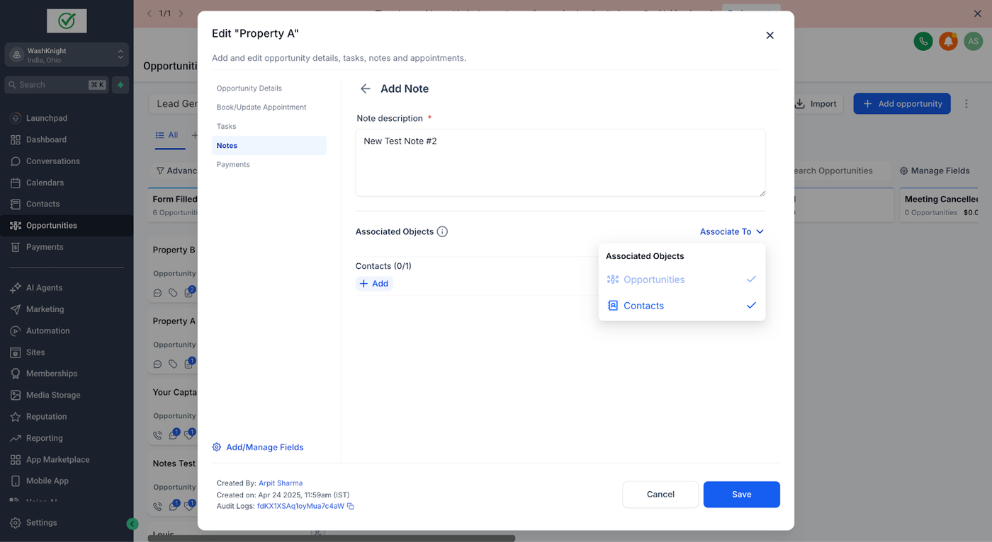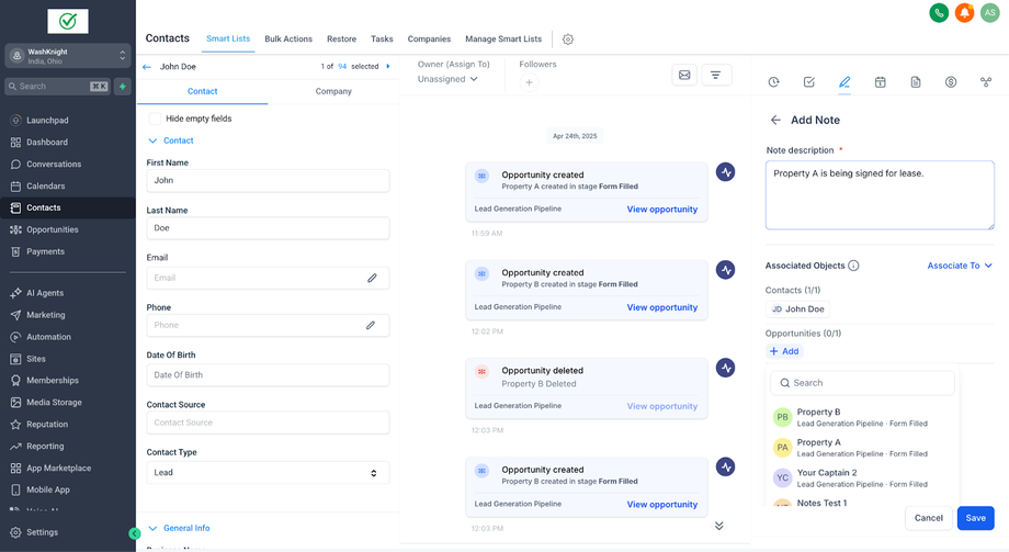 John Doe (ein Kontakt) hat zwei Opportunities für zwei verschiedene Immobilien: Property A und Property B. Sara (die Sales-Agentin & GHL-Admin), die die Immobilien für John Doe verwaltet, möchte spezifische Notizen für jede Opportunity erstellen, um relevante Informationen ausschließlich mit der jeweiligen Opportunity zu verknüpfen.