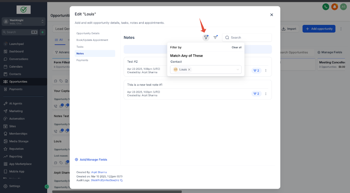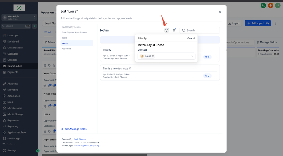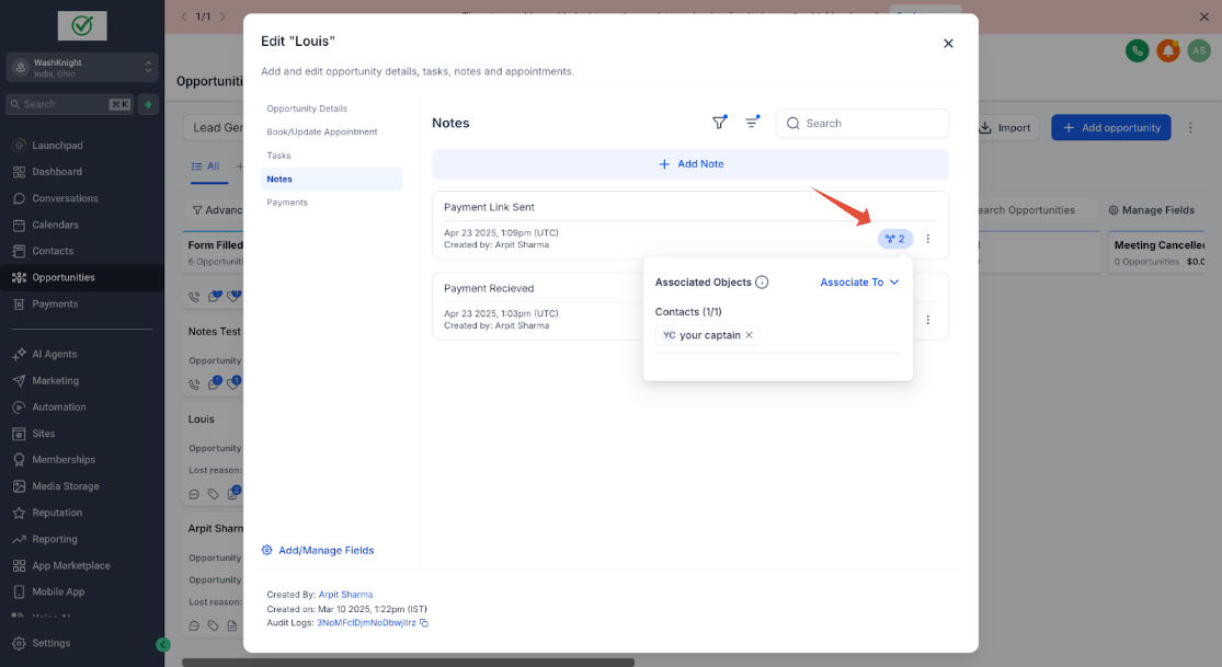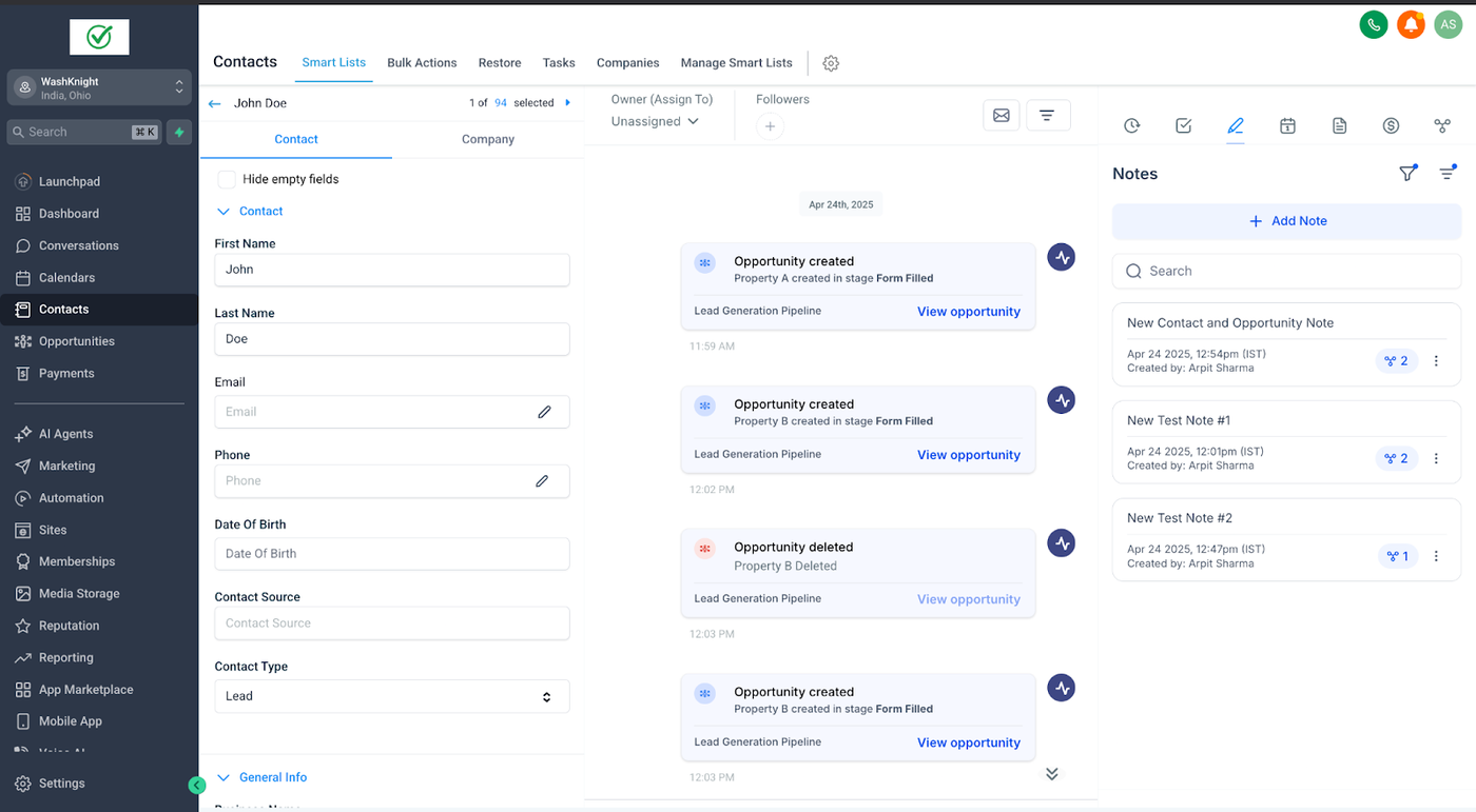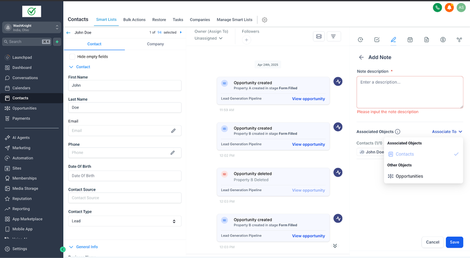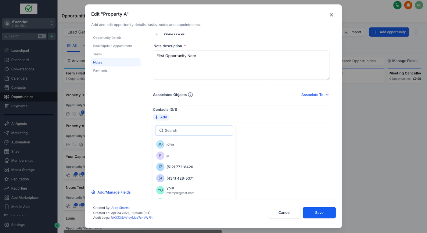 John Doe (ein Kontakt) hat zwei Opportunities für zwei verschiedene Immobilien: Property A und Property B. Sara (die Sales-Agentin & GHL-Admin), die die Immobilien für John Doe verwaltet, möchte spezifische Notizen für jede Opportunity erstellen, um relevante Informationen ausschließlich mit der jeweiligen Opportunity zu verknüpfen.