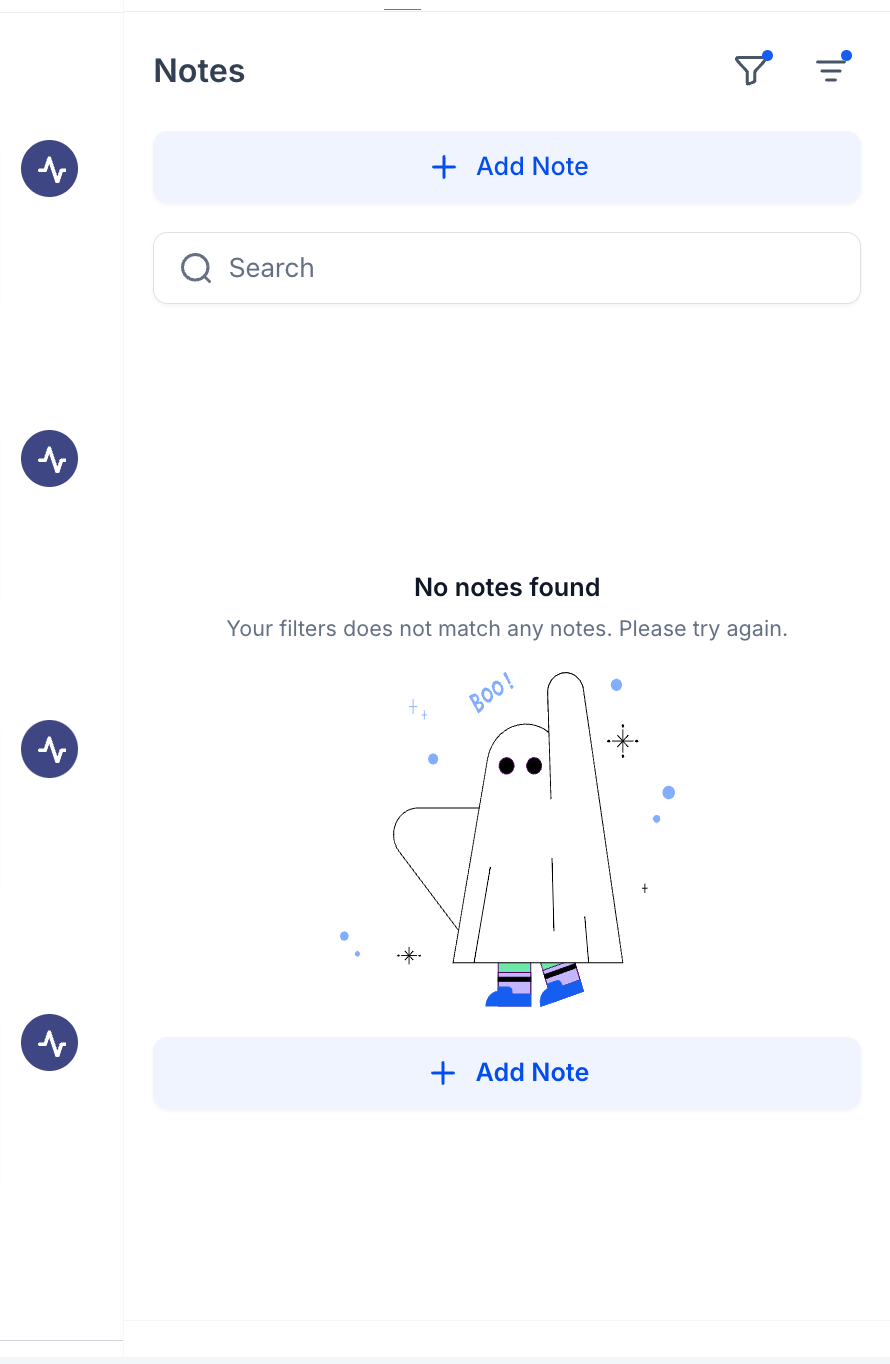 Im Notizen-Tab von Opportunities oder Kontakten können Sie Filter verwenden, um Notizen zu finden, die mit bestimmten Opportunities oder Kontakten verknüpft sind.