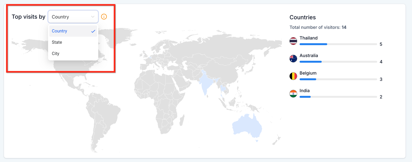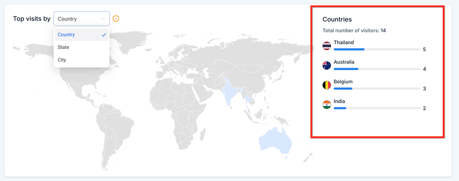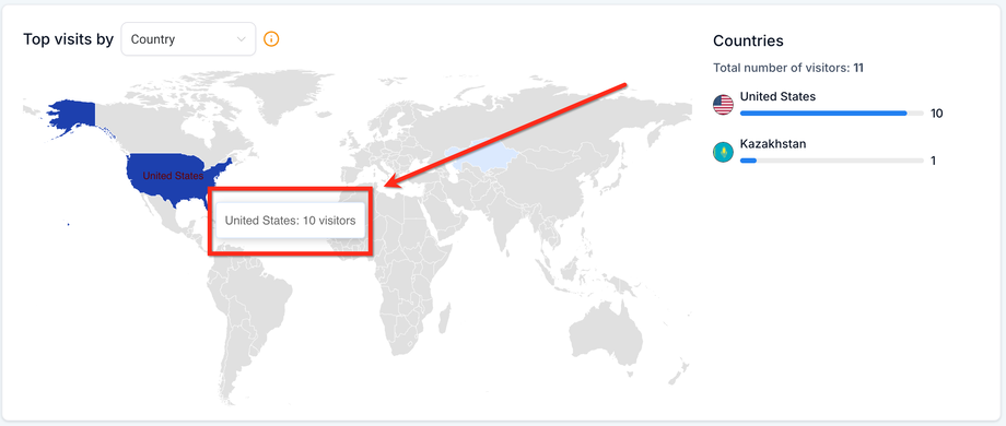 Dieser Artikel erklärt, wie Sie die Top Visits nach Land, Bundesstaat und Stadt im Sites Analytics-Dashboard anzeigen und interpretieren. Die interaktive Heatmap zeigt, woher der Traffic auf Ihrer Website oder in Ihrem Funnel kommt, sodass Sie fundierte Entscheidungen zu Zielgruppen, Content-Strategie und Audience Development treffen können.