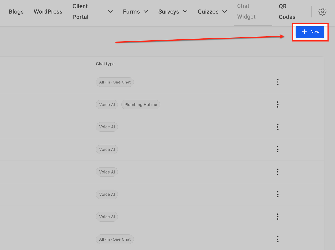 Dort kannst du alle vorhandenen Chat Widgets anzeigen, verwalten und bearbeiten