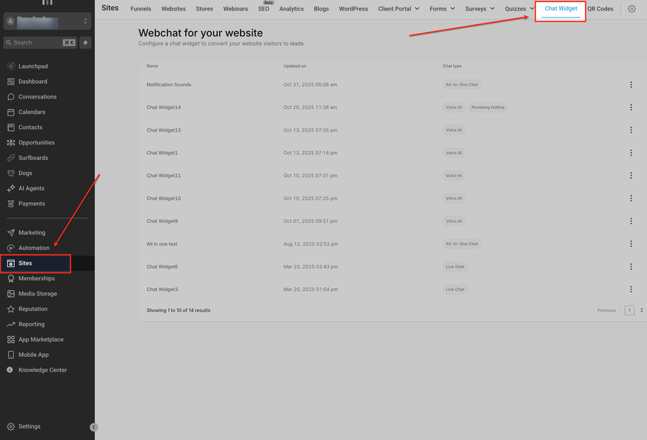 Gehe im linken Menü zu Sites und wähle oben Chat Widget