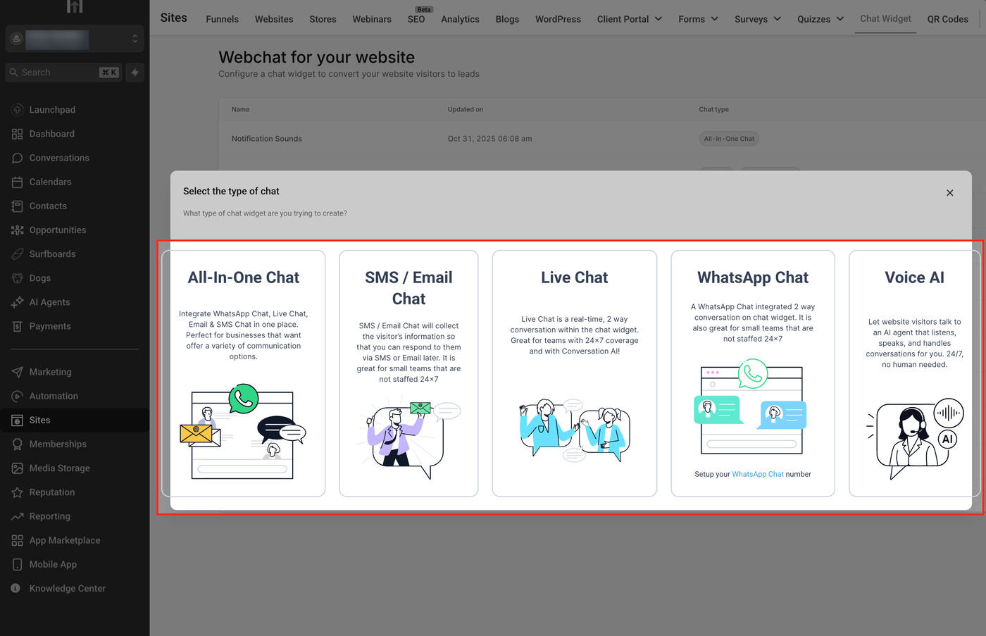 Wähle den gewünschten Widget-Typ aus: WhatsApp, E-Mail/SMS, All-in-One Chat oder Voice AI