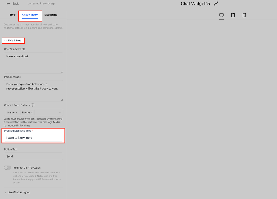 Passe dort den Titel des Chatfensters, die Intro-Nachricht und den vorausgefüllten Nachrichtentext an