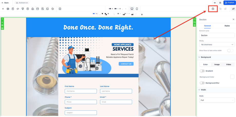 Klicke auf das Uhr-Symbol oben rechts im Site-Editor. Dadurch wird das Modul für den Versionsverlauf geöffnet.
