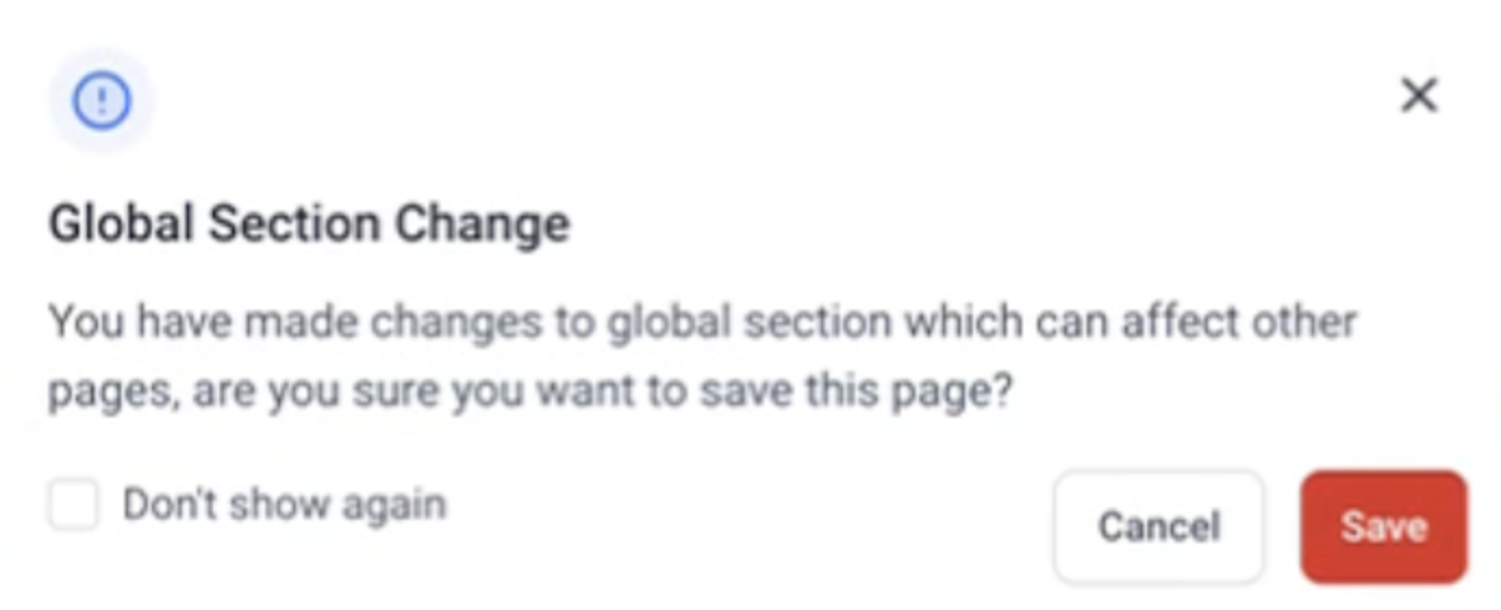 Beim Bearbeiten einer Global Section erscheint ein Pop-up-Hinweis, dass die Änderungen auf alle Instanzen angewendet werden, in denen dieser Abschnitt verwendet wird.