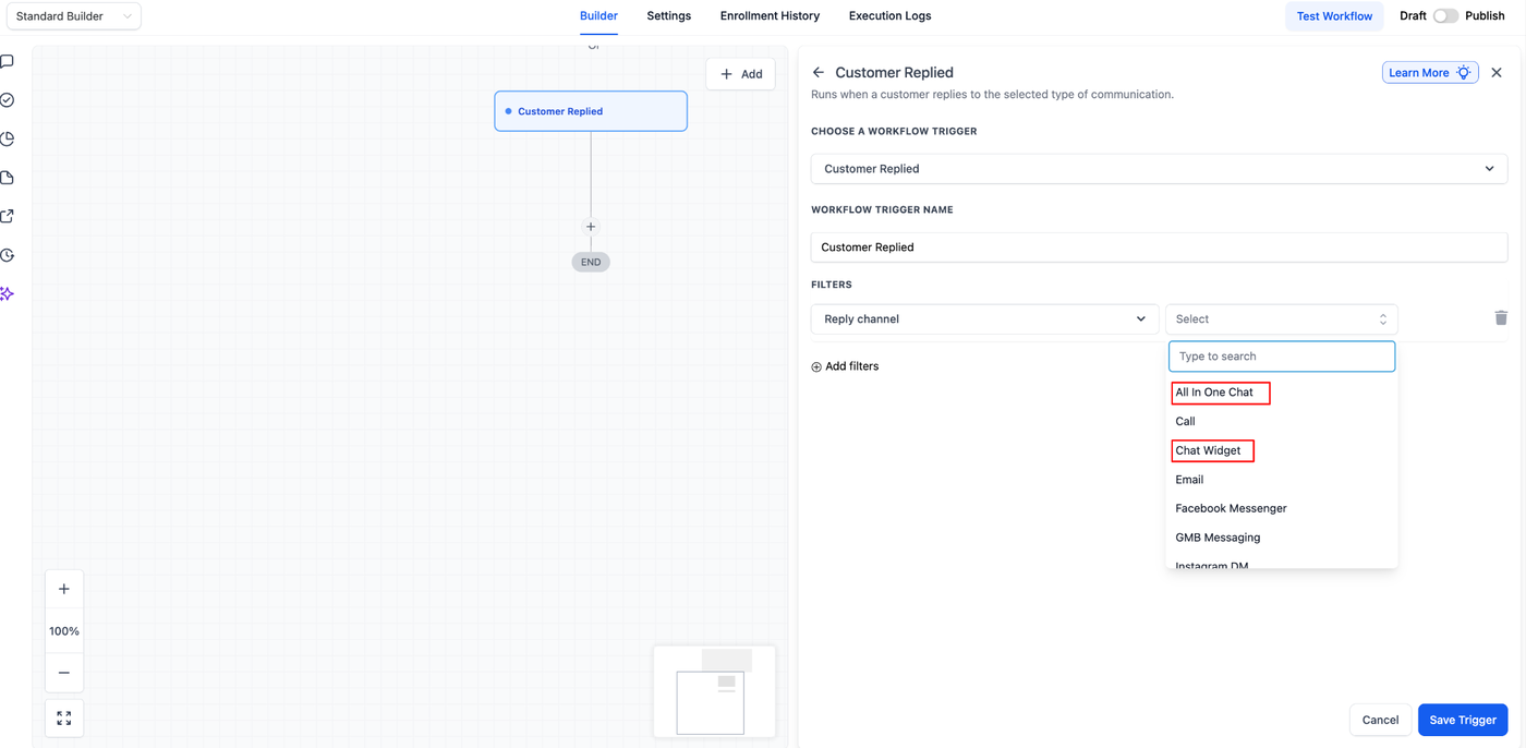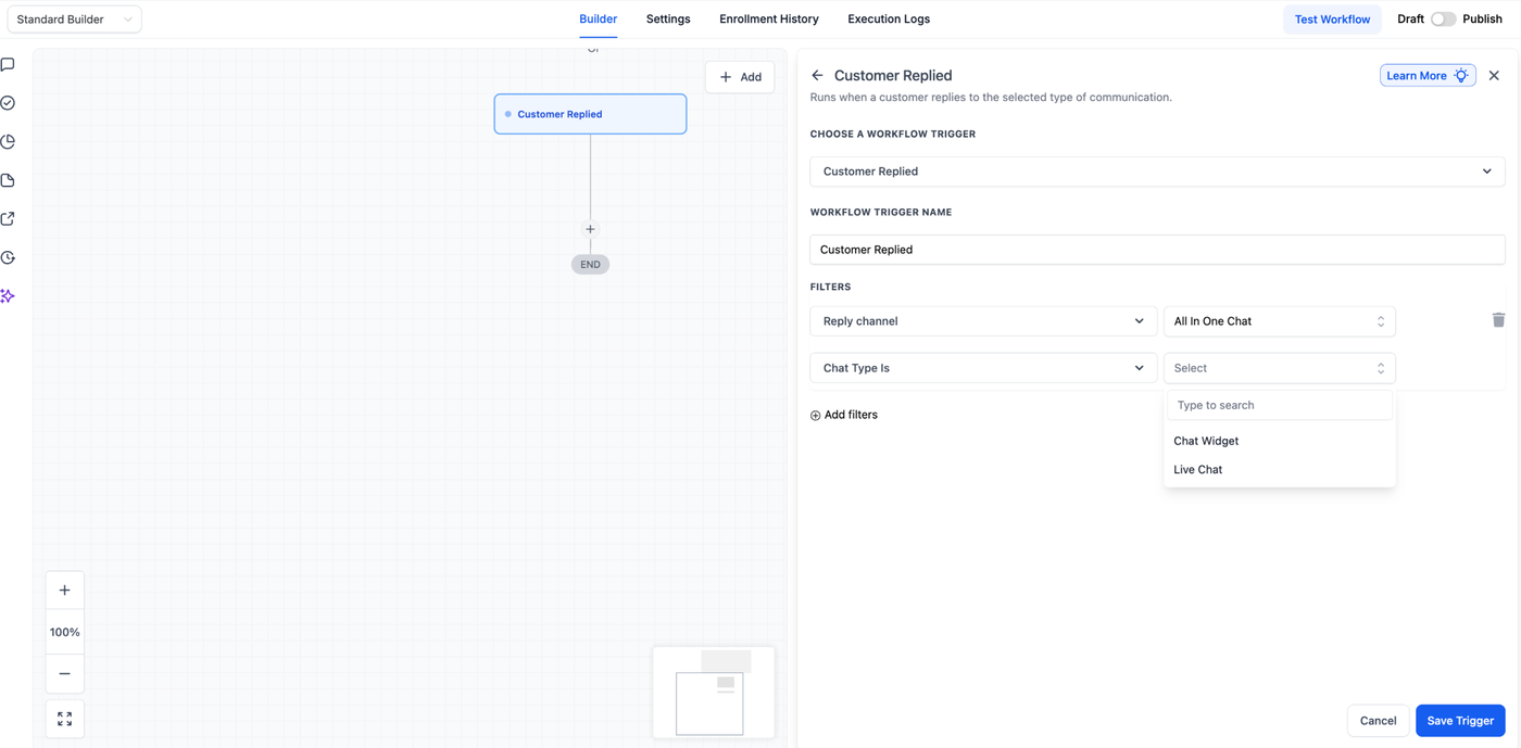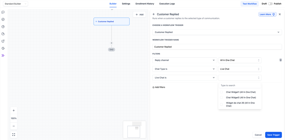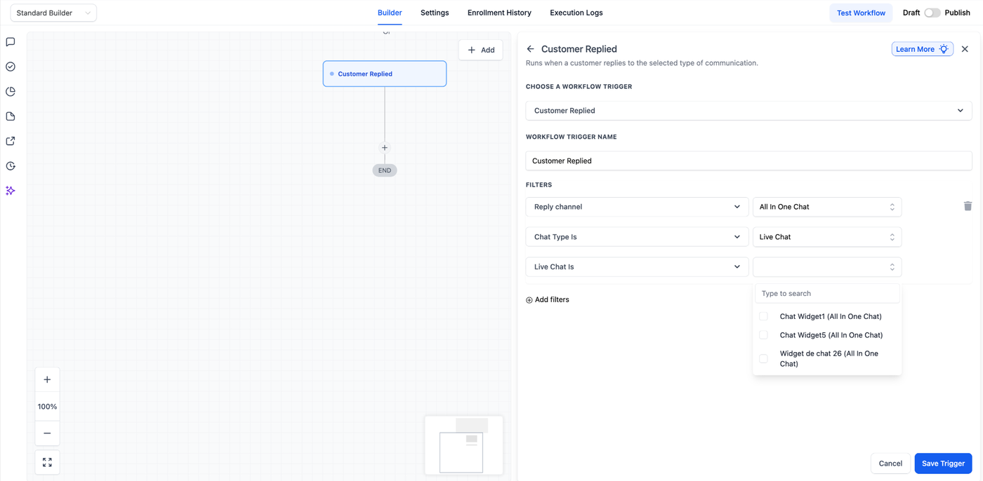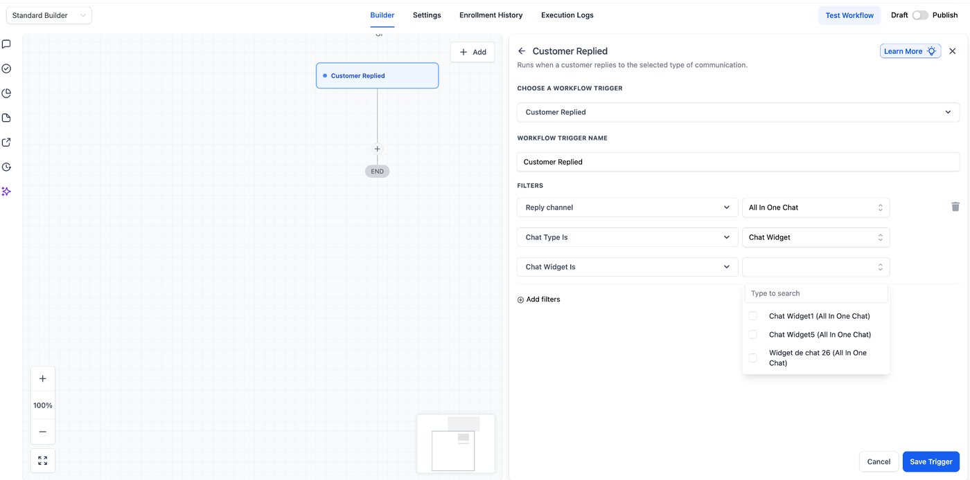 Diese Anleitung bietet eine umfassende Übersicht zur Konfiguration von Workflows, die ausgeführt werden, wenn ein Kunde über ein All-in-One Chat Widget antwortet – mithilfe des Triggers „Customer Replied“ in Workflows.