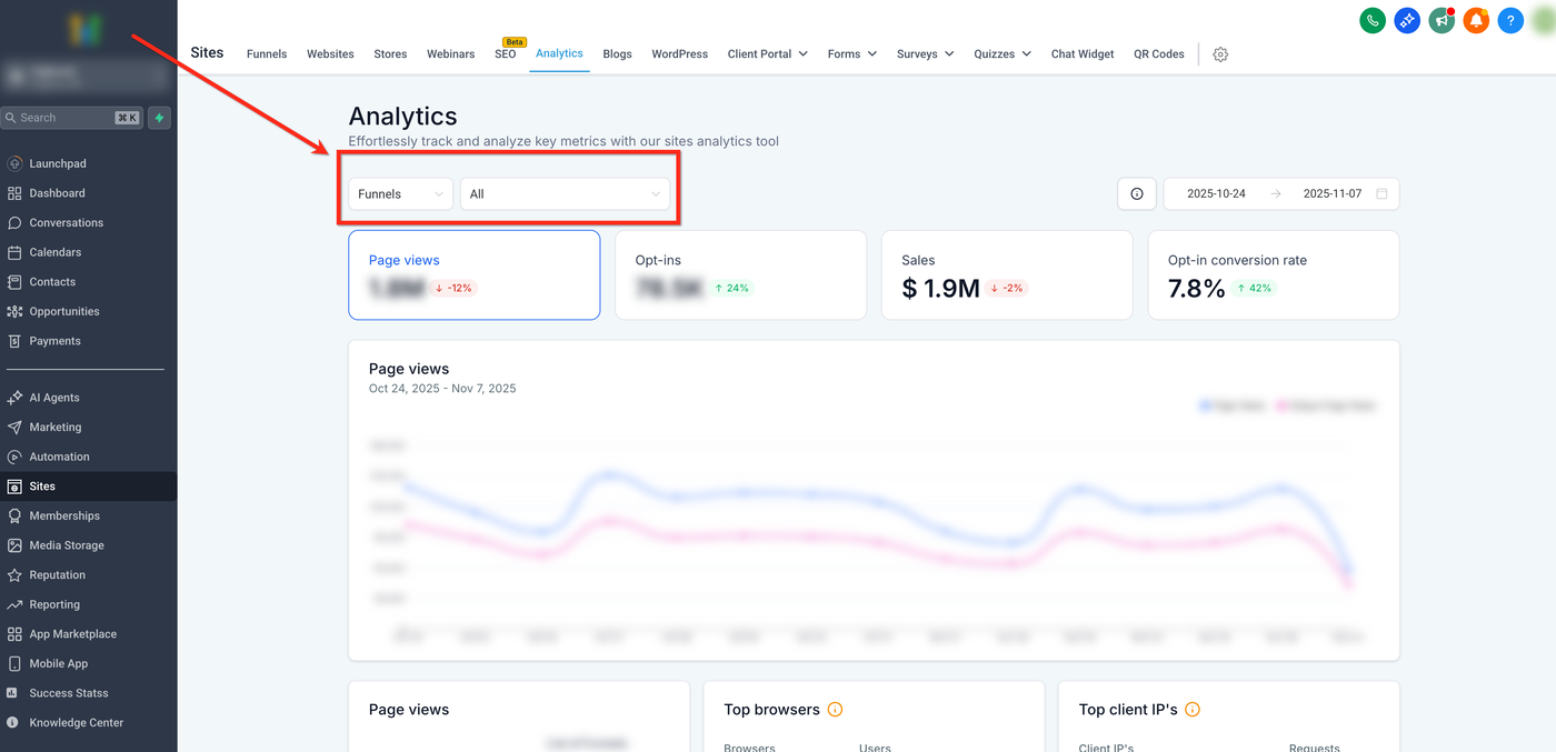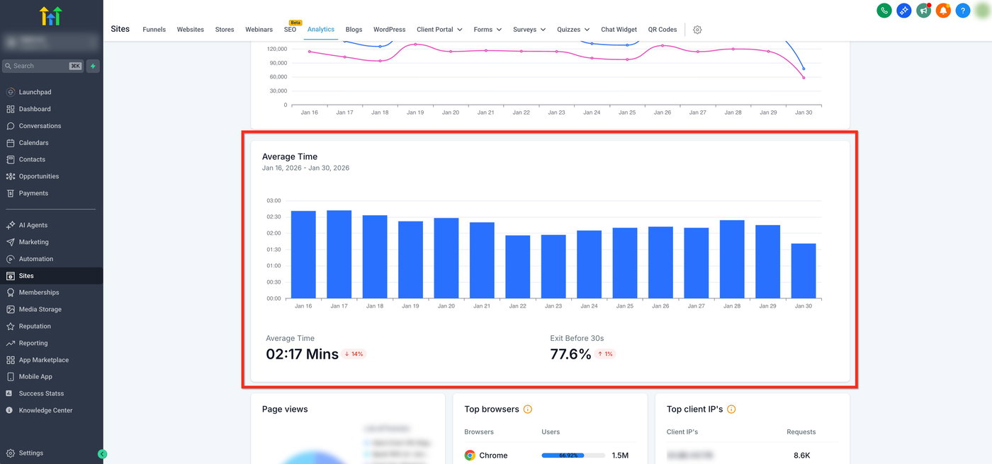 Average Time ist eine spezielle Ansicht in Sites → Analytics, die zeigt, wie lange Besucher aktiv auf Seiten innerhalb von Funnels, Websites und Webinaren verbringen.