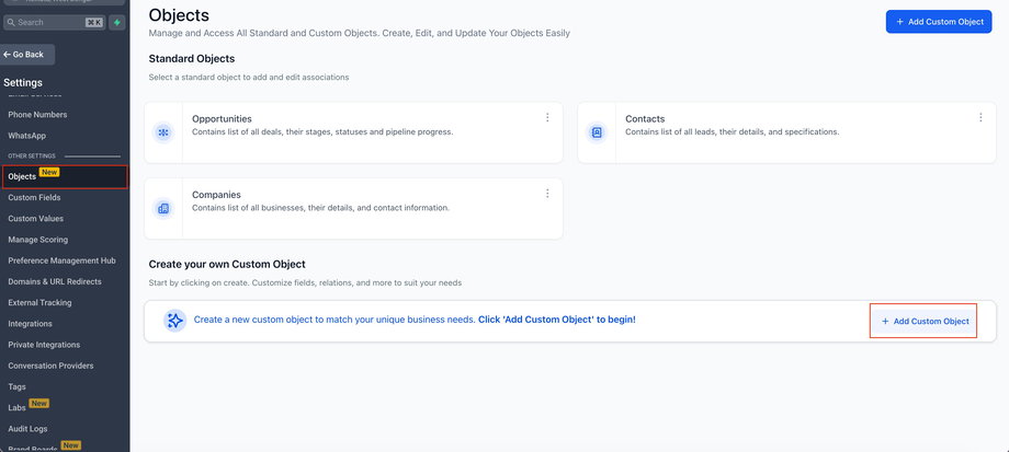 Gehe zu Einstellungen > Benutzerdefinierte Objekte, um sie zu erstellen oder zu verwalten