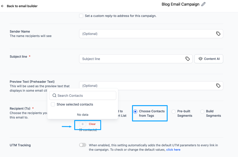 Unter Empfänger wählen Sie Kontakte nach Tag → Blog.
