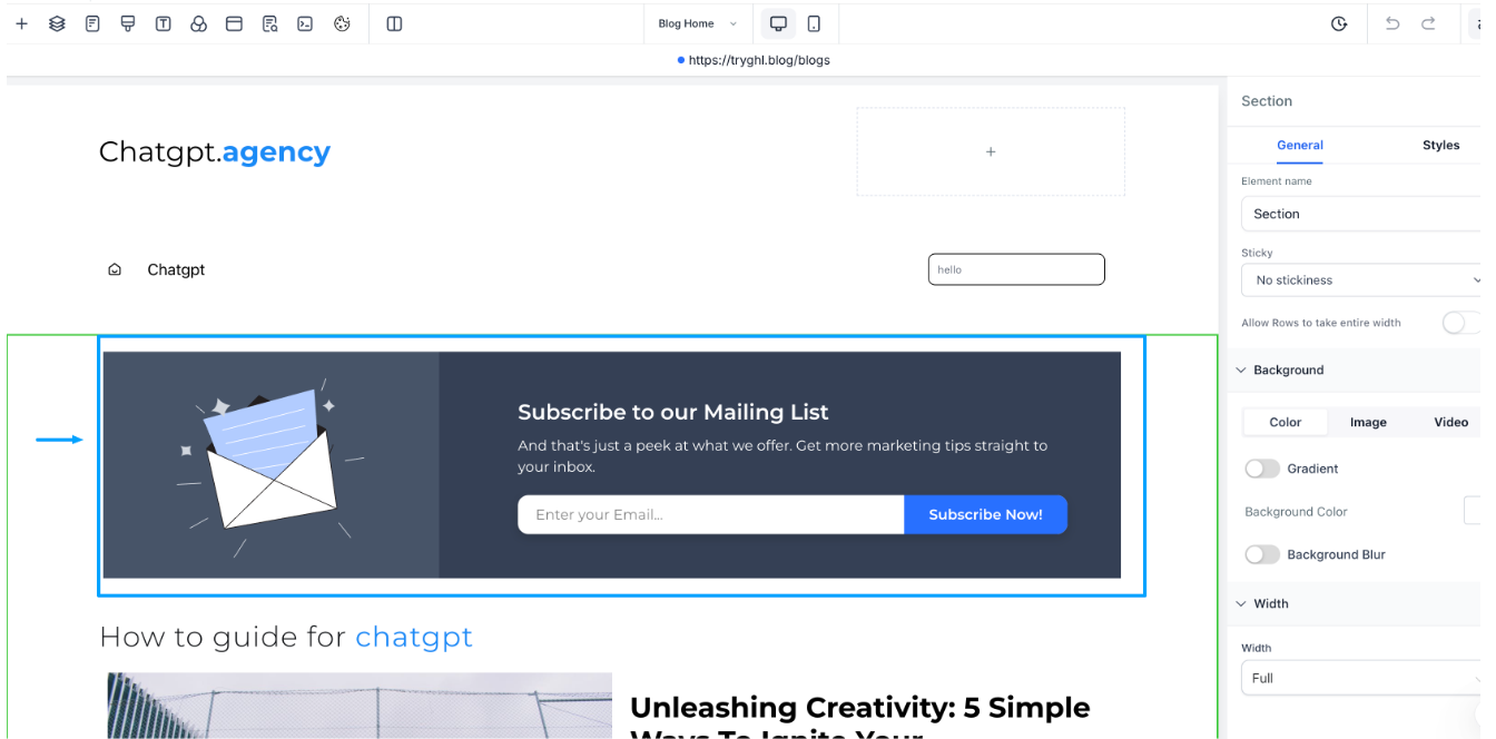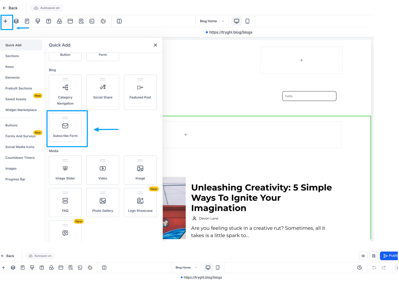 Ziehen Sie im Editor das Abonnementformular-Element per Drag-and-Drop auf Ihre Blogseite.