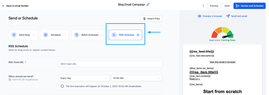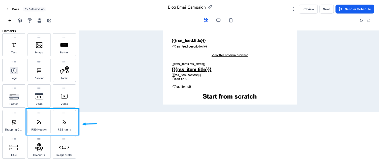 Wählen Sie RSS-Zeitplan, damit automatisch neue Blogbeiträge eingefügt werden.