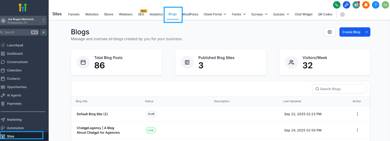Wählen Sie Ihre Blog-Site aus.