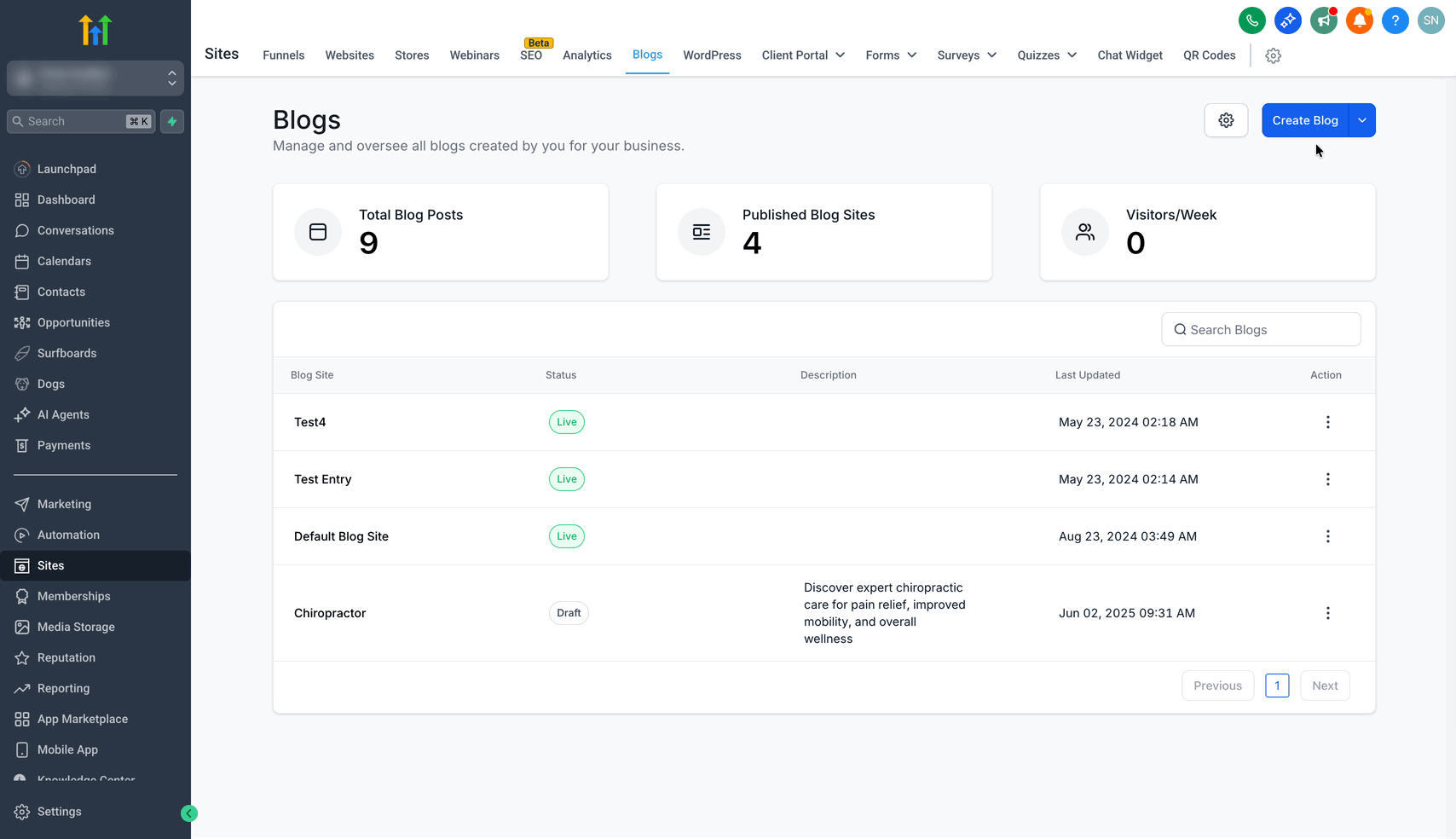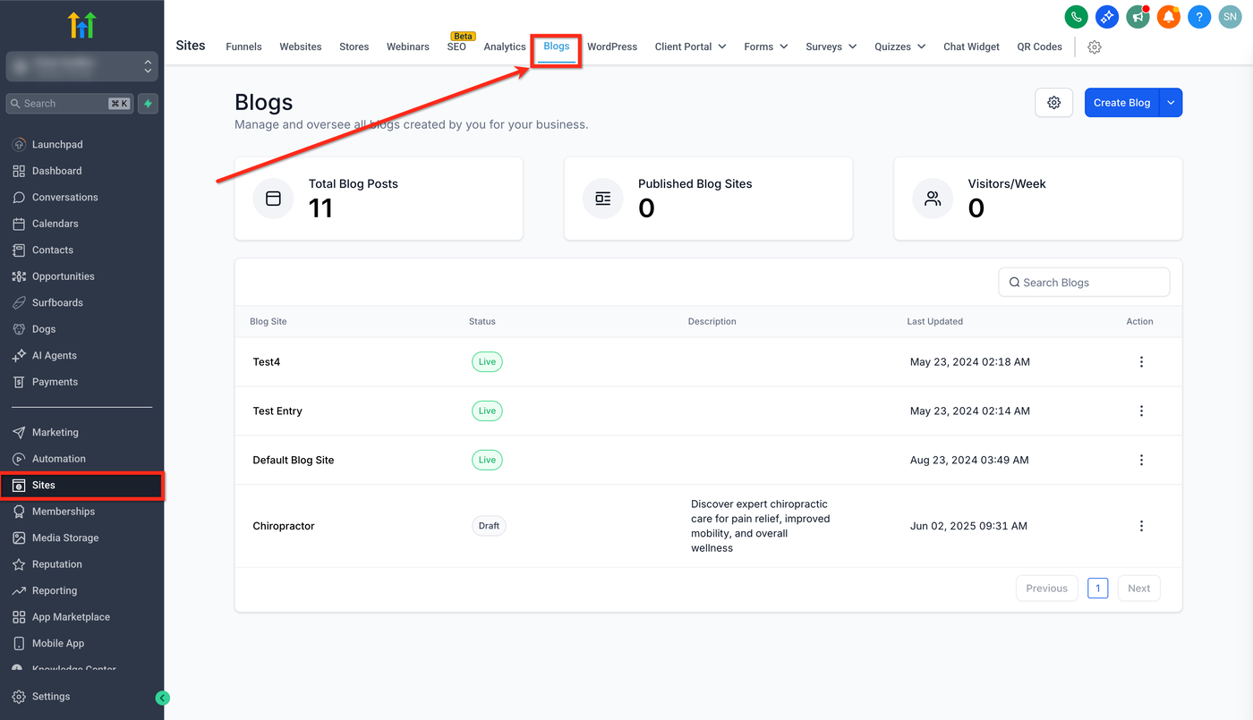 Klicken Sie im linken Menü auf Sites → Blogs.