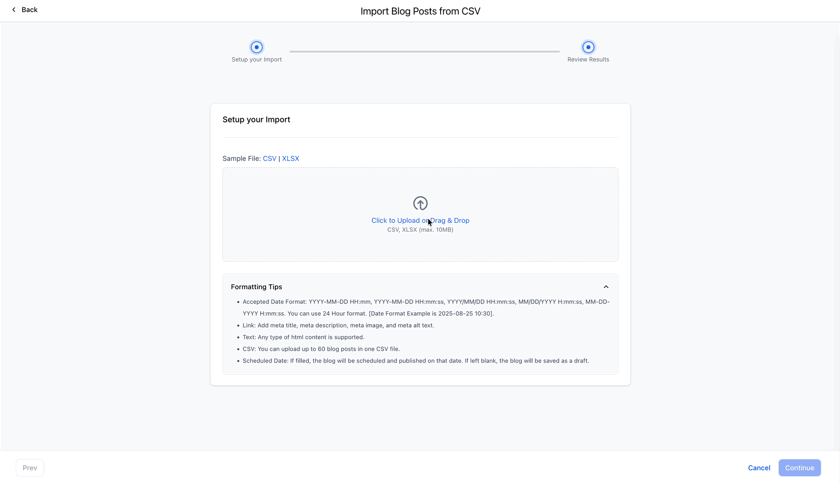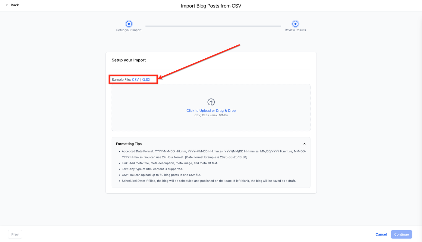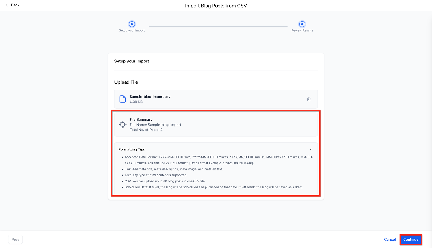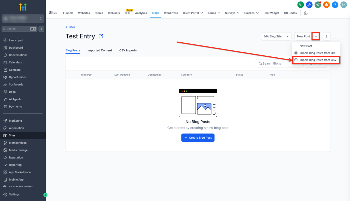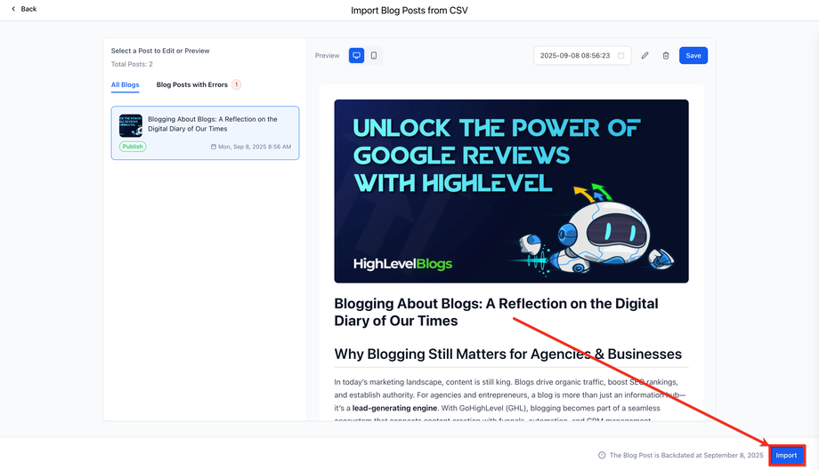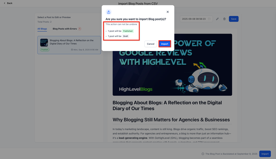 Wählen Sie Import Blog Post from CSV.