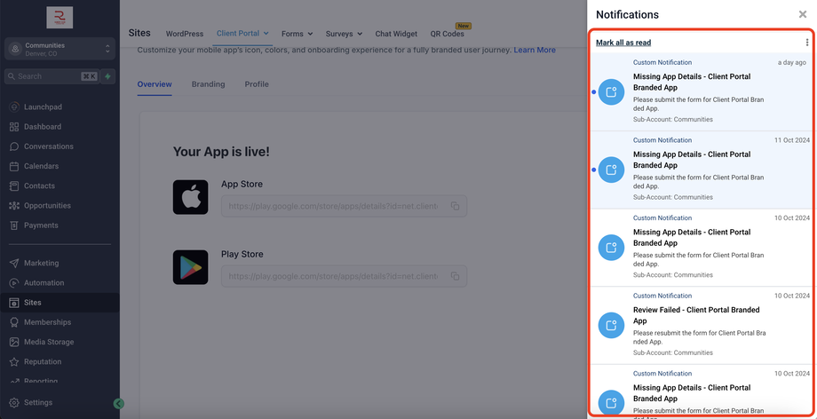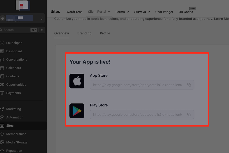 Gehe zu Subaccount → Client Portal → Branded Mobile App, um zu starten. Mit nur wenigen Klicks bist du auf dem Weg, deine eigene App zu veröffentlichen. Lass uns deine App live bringen!