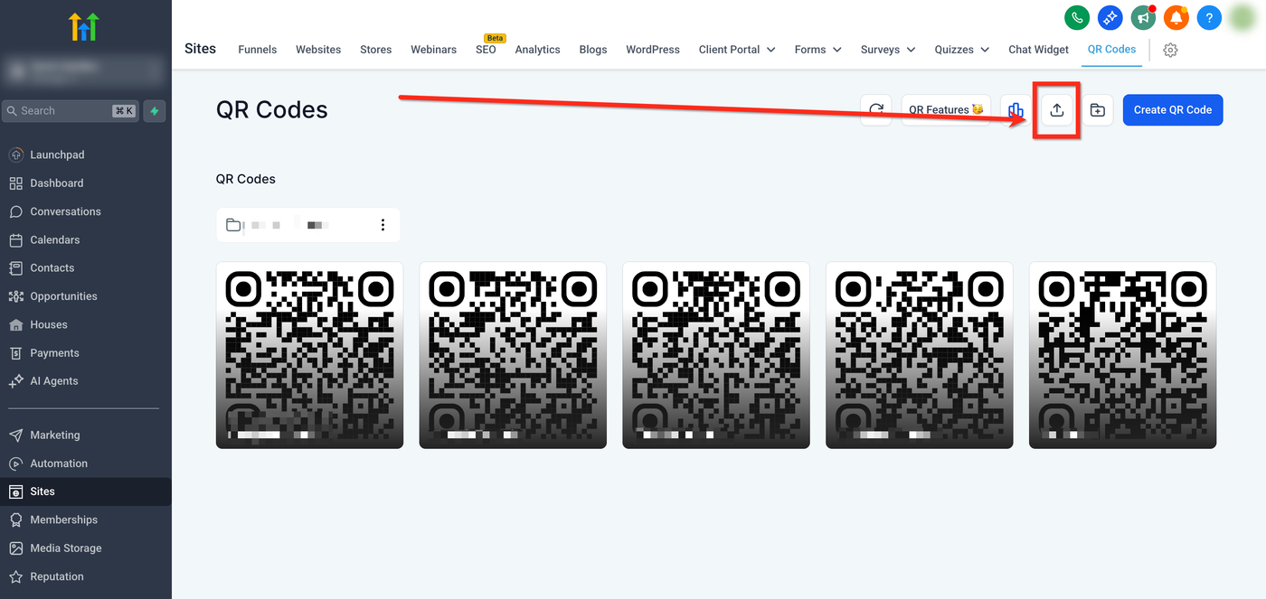 Klicke auf das Symbol „Bulk QR Codes erstellen“ oben rechts.