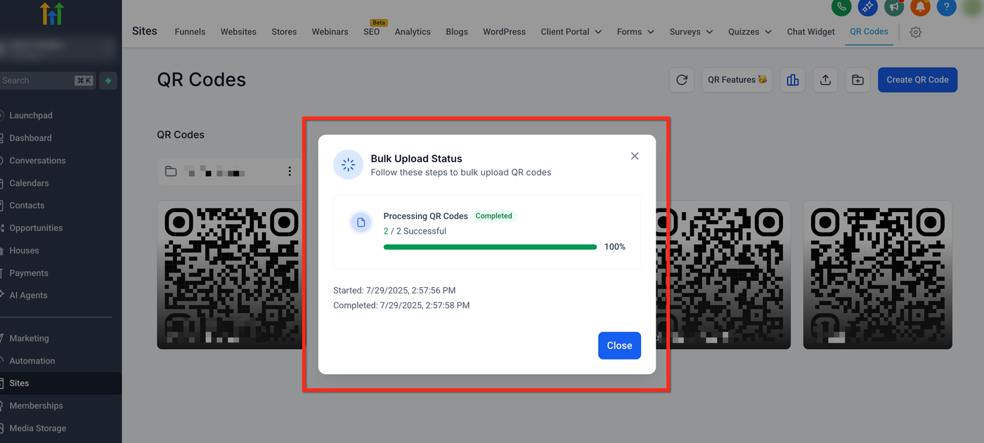 Wenn alle Zeilen erfolgreich verarbeitet wurden, klicke auf „Schließen“. Navigiere zu deinem ausgewählten Ordner, um deine neu erstellten QR Codes anzusehen, auszuwählen und als PNG, SVG oder PDF herunterzuladen.