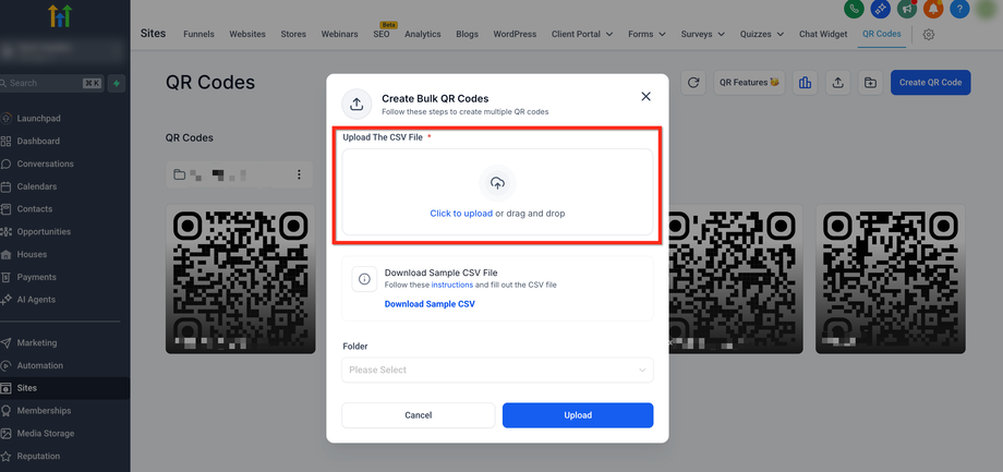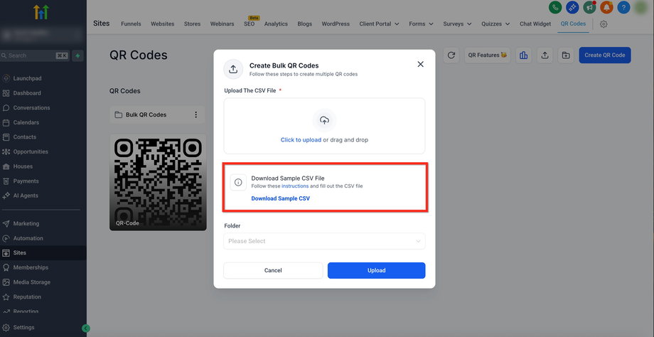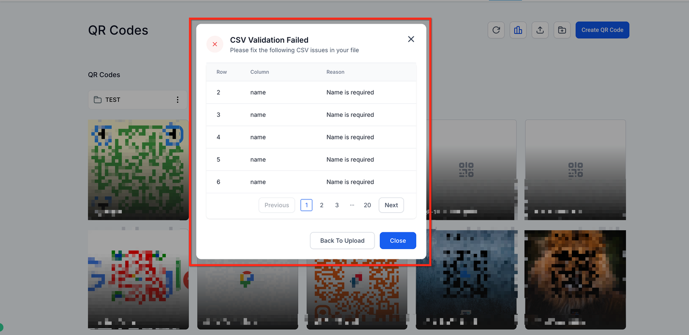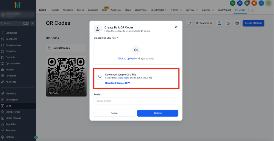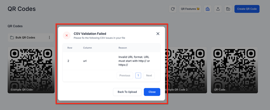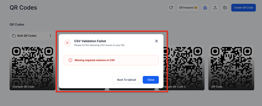 Klicke im Popup „Bulk QR Codes erstellen“ auf „Beispiel-CSV herunterladen“, um eine vorformatierte Vorlage zu verwenden.