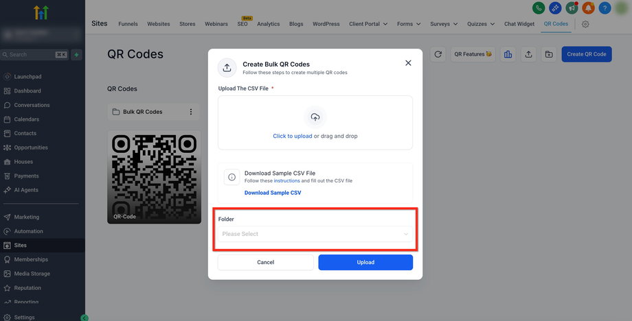 Die Zuweisung zu Ordnern hält deinen Arbeitsbereich übersichtlich und erleichtert die Organisation. Beim Erstellen von Bulk QR Codes kannst du einen vorhandenen Ordner aus dem Dropdown-Menü auswählen. Der Ordner muss vorher erstellt werden, da nur bestehende Ordner während des Uploads angezeigt werden. Alle generierten QR Codes in der Bulk-Erstellung übernehmen den ausgewählten Ordner. Wenn kein Ordner ausgewählt wird, werden die QR Codes im Hauptordner gespeichert.