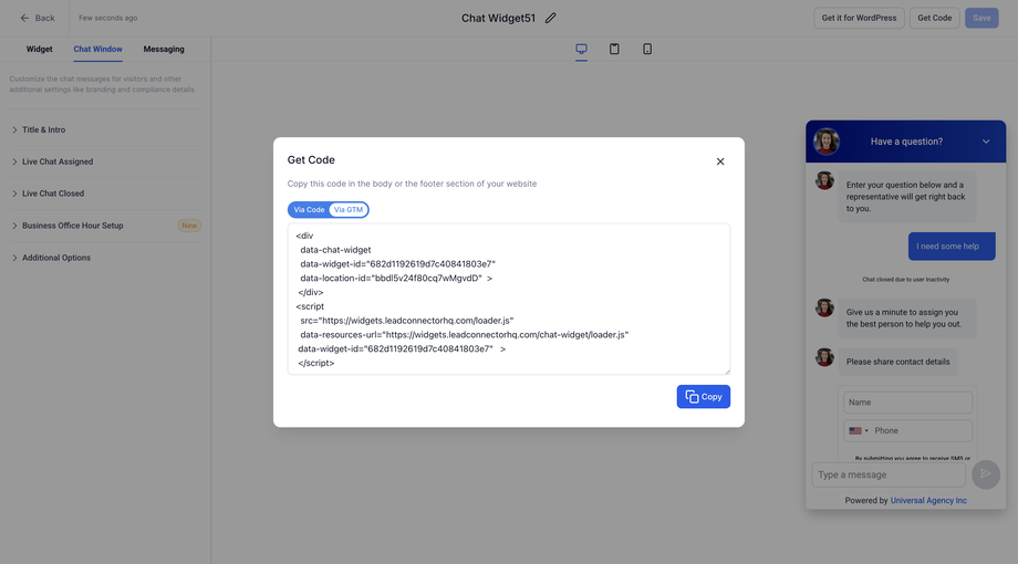 <!-- Chat Widget Embed --><div data-chat-widget data-widget-id="widget-id" data-location-id="location-id"></div><script src="https://widgets.leadconnectorhq.com/loader.js" data-resources-url="https://widgets.leadconnectorhq.com/chat-widget/loader.js" data-widget-id="widget-id"></script>