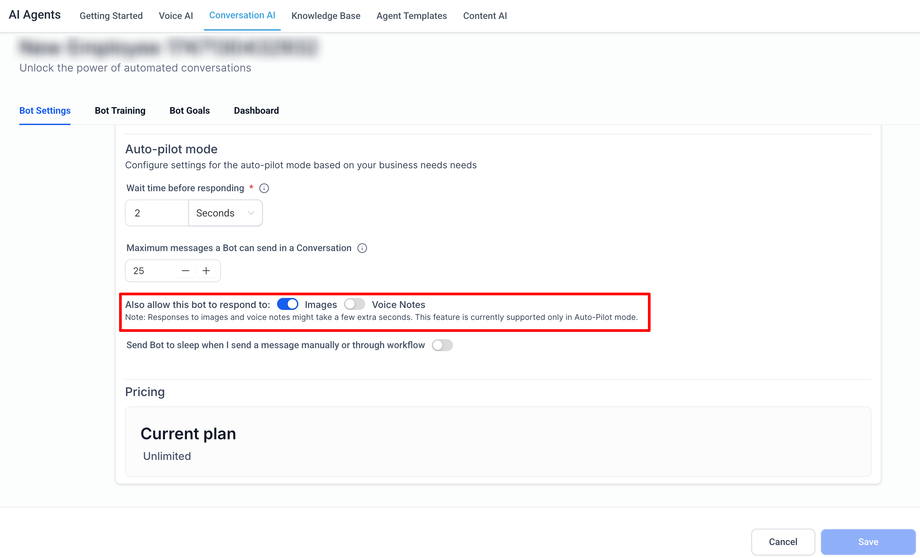 Aktiviere in deinem AI Agent die Option Allow this bot to respond to images