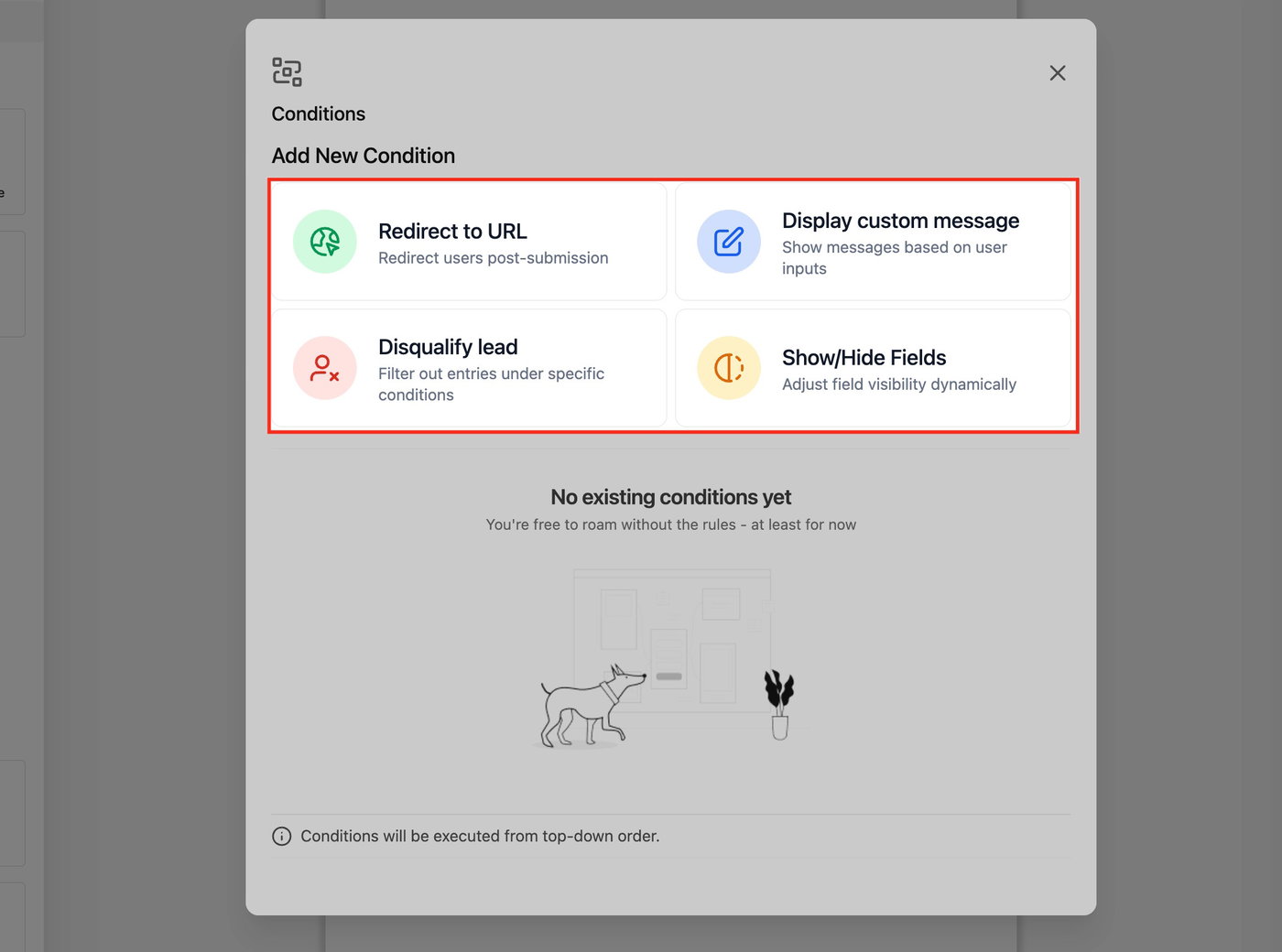 Conditional Logic v2 hilft dir, intelligentere und dynamischere Formulare und Surveys zu erstellen. Sie ermöglicht es dir, Felder ein- oder auszublenden, Nutzer weiterzuleiten, Nachrichten anzuzeigen, Leads zu disqualifizieren oder zu anderen Slides zu springen – alles basierend darauf, wie jemand antwortet.