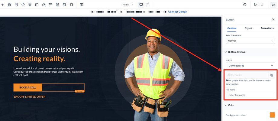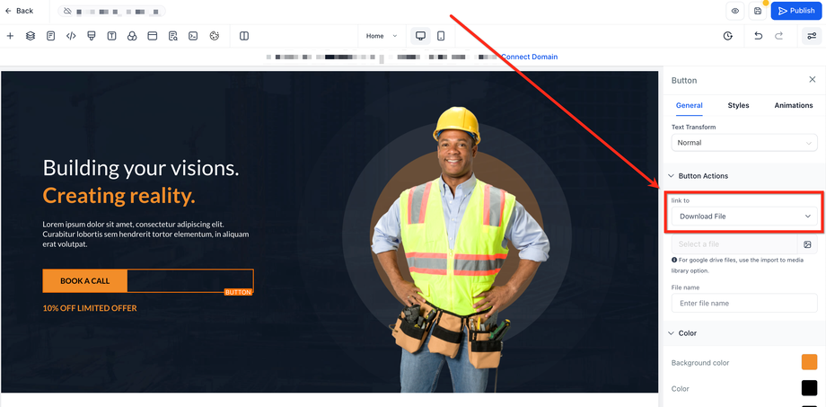 Buttons: Im Einstellungsbereich unter Button Actions den Dropdown Link To auswählen → Download File