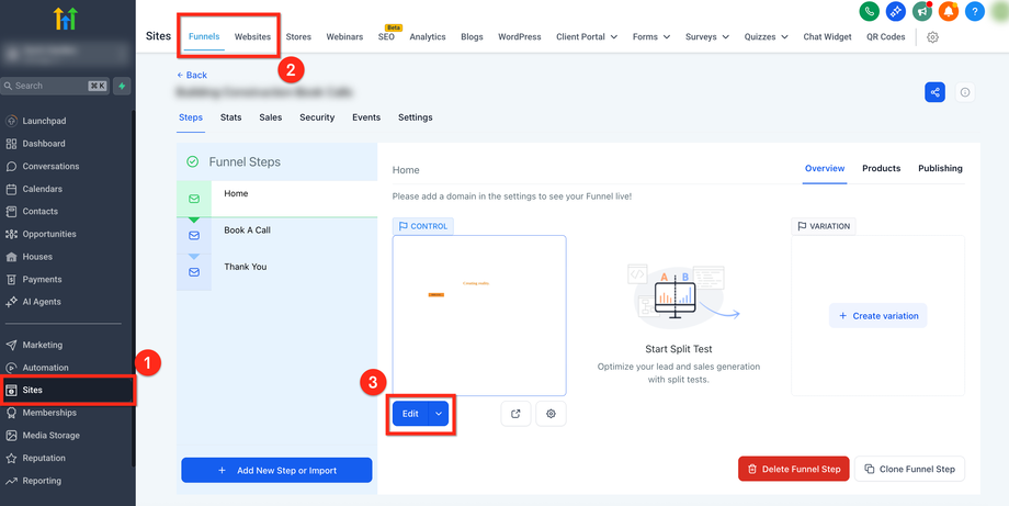 Klicke auf die gewünschte Website oder den Funnel und gehe zur spezifischen Seite oder Stufe. Klicke auf Edit, um den Builder zu öffnen