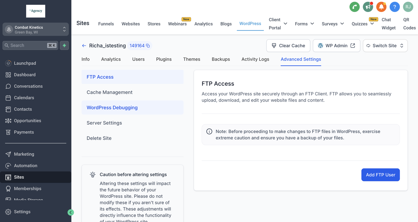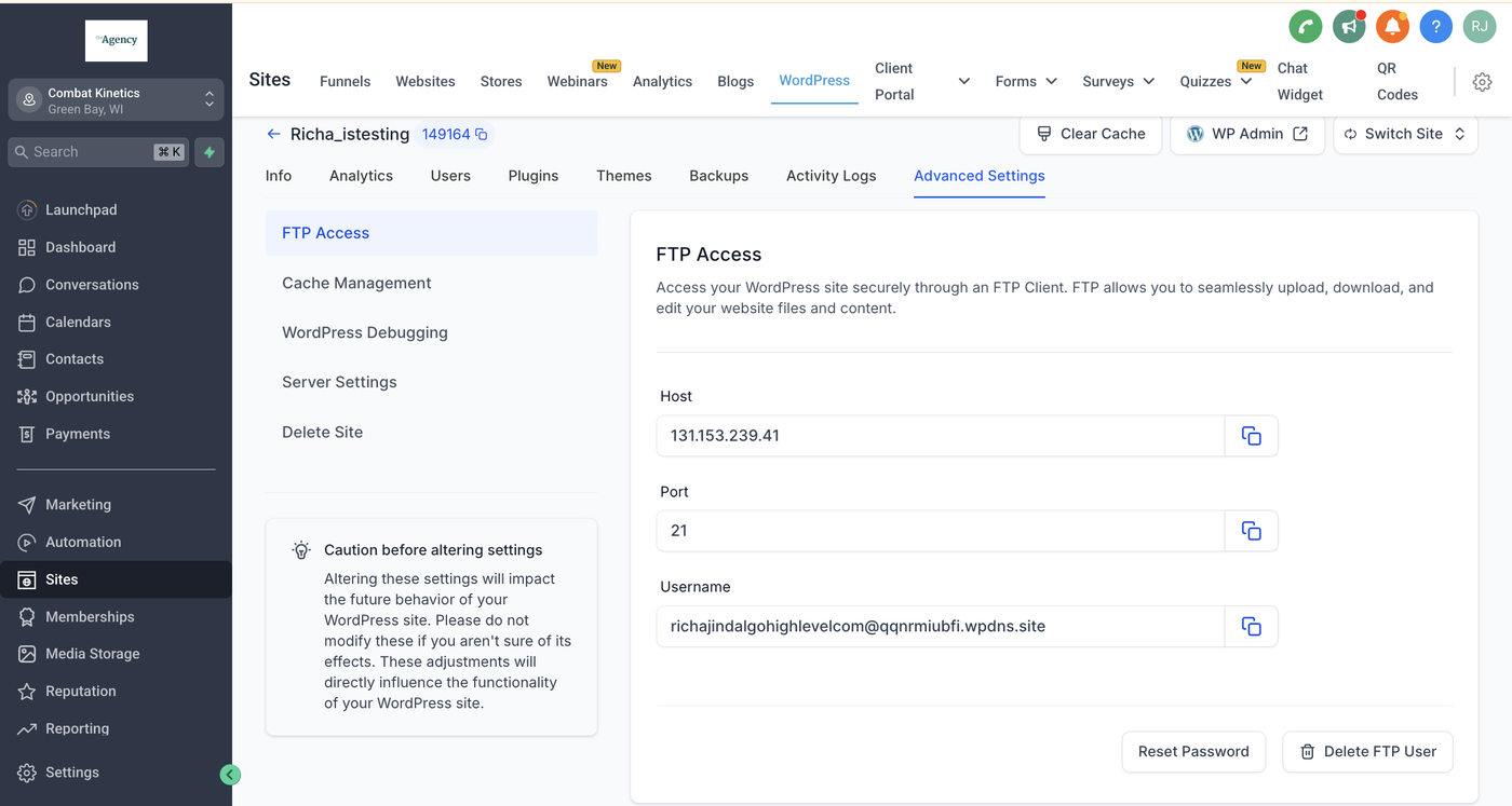 Gehe zu Sites → WordPress → Advanced Settings → FTP Access.