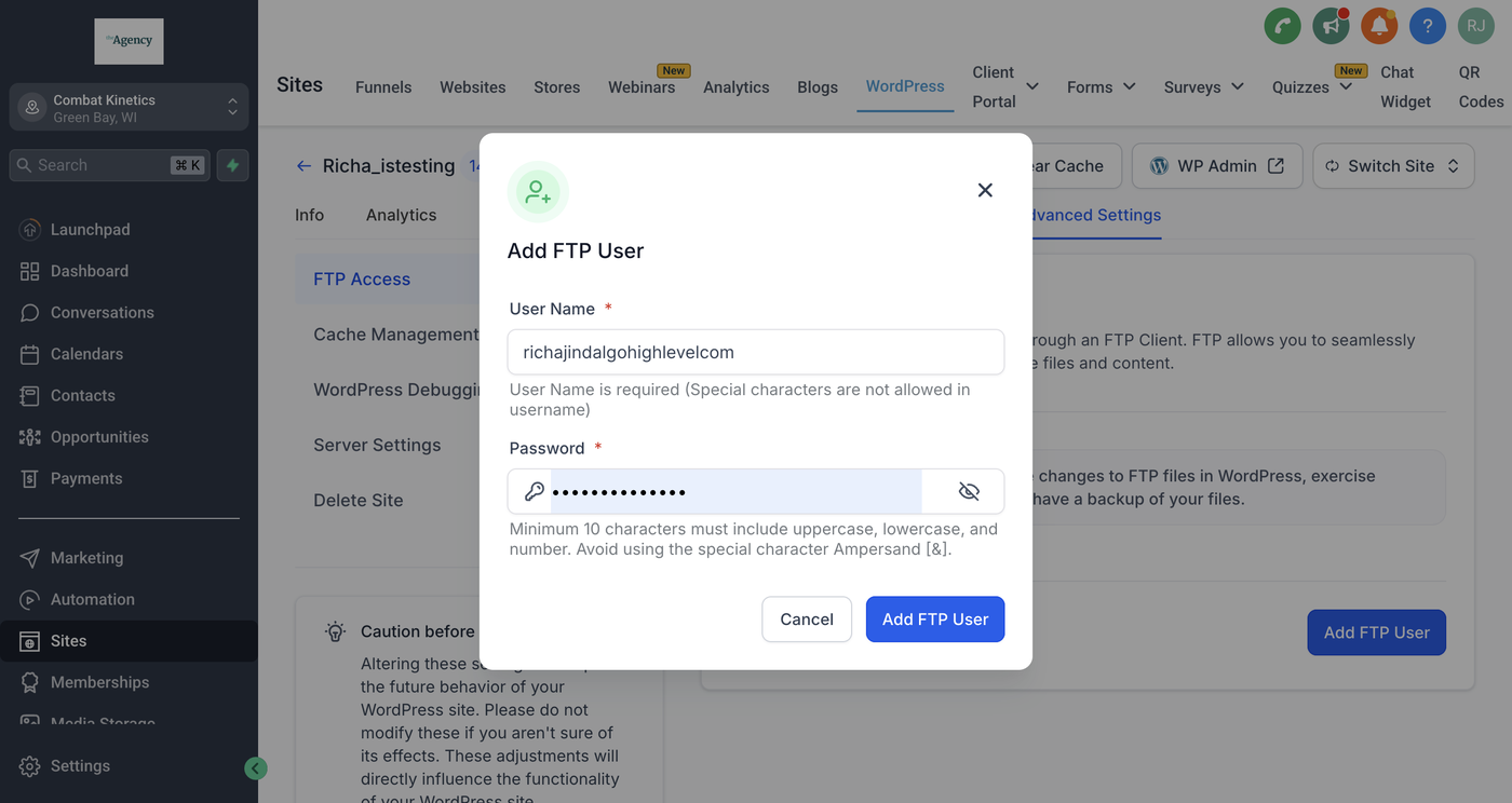 Klicke auf Add FTP User und lege die Zugangsdaten fest.
